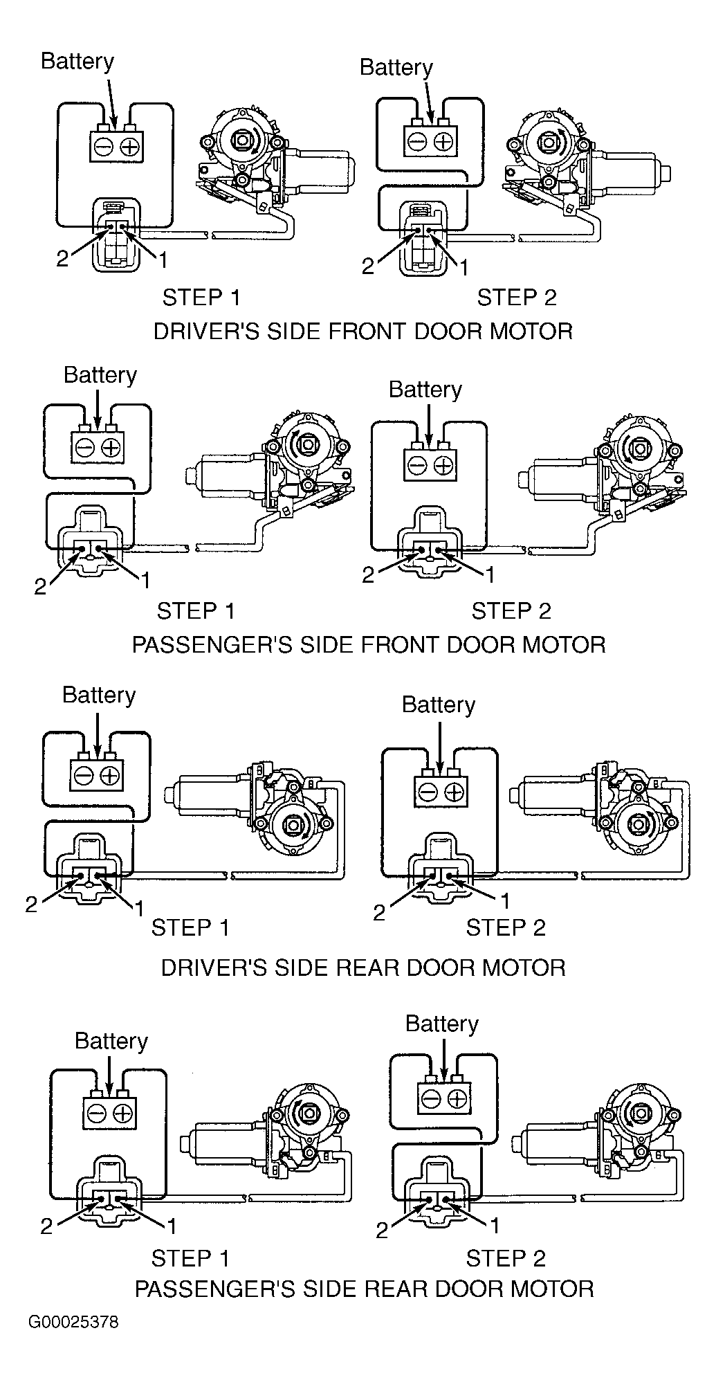 - Reverse jumper wires so polarity is reversed and check that power window motor rotates counterclockwise. Perform STEP 2 in illustration. See Fig 1. Replace power window motor if operation is not as specified. See POWER WINDOWS - CARS article.