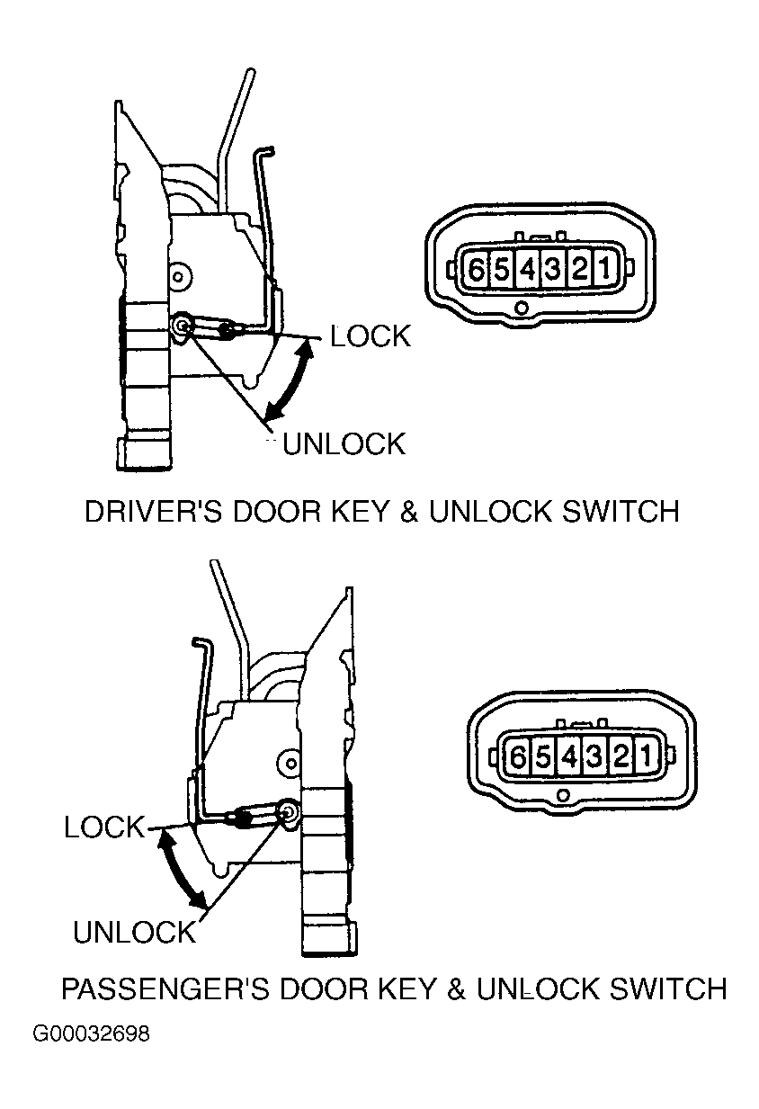 Using ohmmeter, check that continuity and no continuity is as specified between indicated door lock assembly electrical terminal for door key lock and unlock switch in relation to switch position. See DOOR KEY LOCK & UNLOCK SWITCH CONTINUITY table. Replace door key lock and unlock switch if continuity is not as specified.DOOR KEY LOCK & UNLOCK SWITCH CONTINUITY