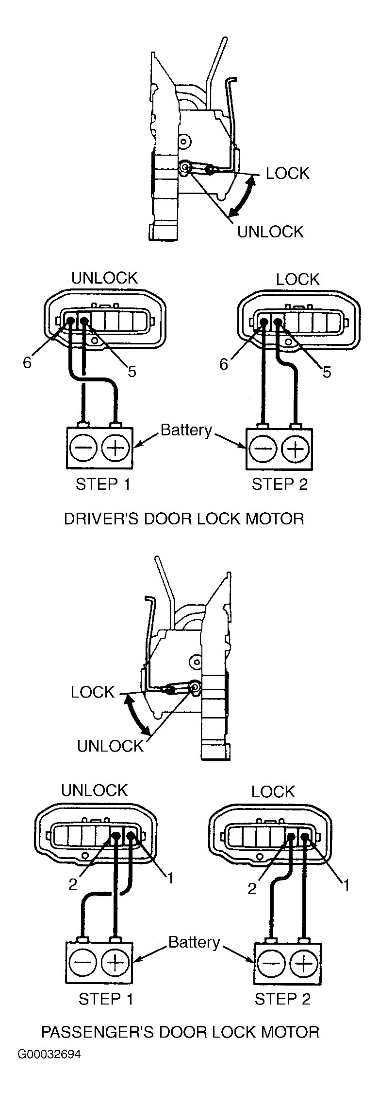 - Reverse jumper wires so polarity is reversed and check that door lock motor moves to LOCK position. Perform STEP 2 in illustration. See Fig 1. Replace door lock assembly if door lock motor does not operate as specified.