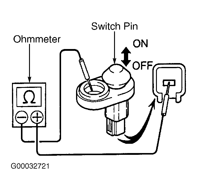 Remove door courtesy switch from pillar post at rear of the door. See Figure. Using ohmmeter, check that continuity exists between electrical terminal and body of door courtesy switch with switch pin released to ON position and no continuity exists with switch pin depressed to OFF position. See Fig 1. Replace door courtesy switch if defective.