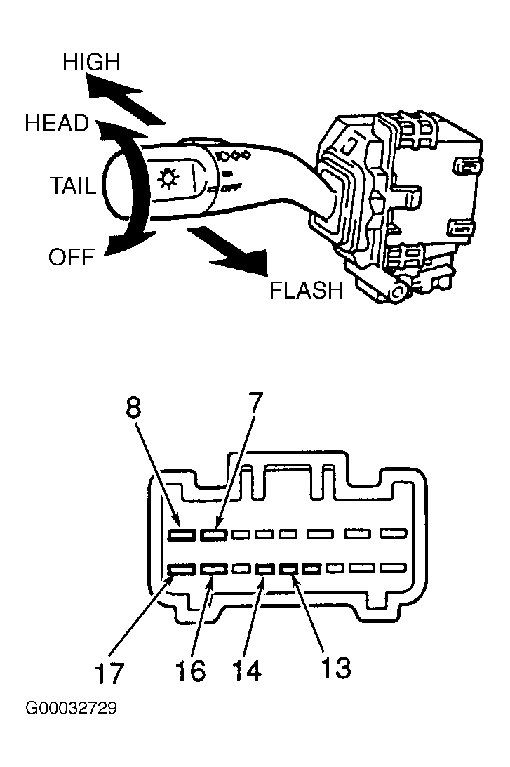Using ohmmeter, check for no continuity and continuity between specified electrical terminals on headlight control switch in relation to headlight control switch position. See Fig 1. See HEADLIGHT CONTROL SWITCH CONTINUITY table. Replace headlight control switch if defective.HEADLIGHT CONTROL SWITCH CONTINUITY