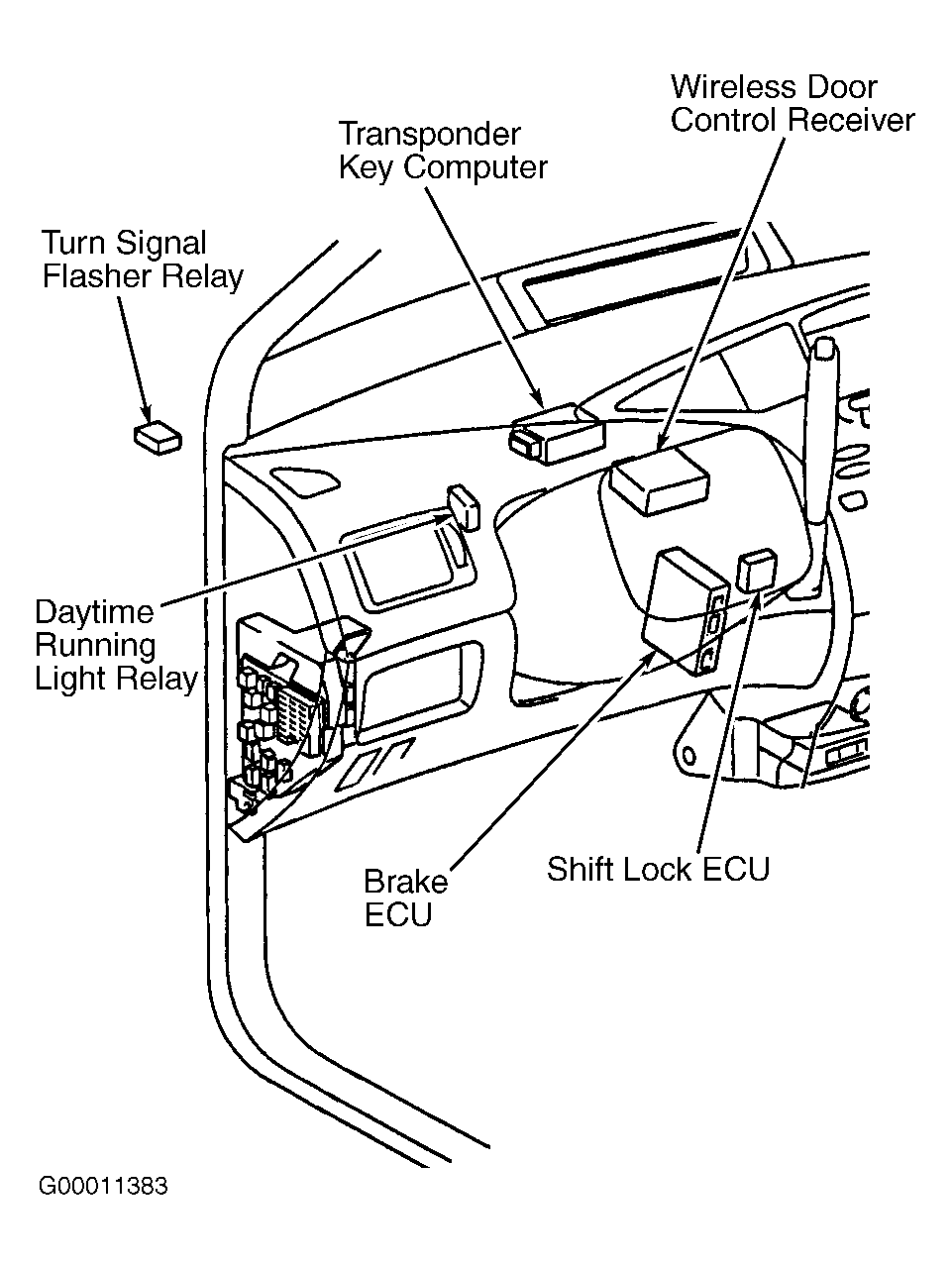- Ensure ignition is off. Disconnect electrical connector at wireless door control receiver. Wireless door control receiver is located near center of instrument panel and contains a 5-pin electrical connector. See Fig 1. Note location of Body Electronic Control Unit (ECU) at driver's side of instrument panel on the fuse/relay box. See Figure. Body ECU uses an 18-pin and 20-pin electrical connector. Disconnect electrical connector B8 at body ECU. See Figure.