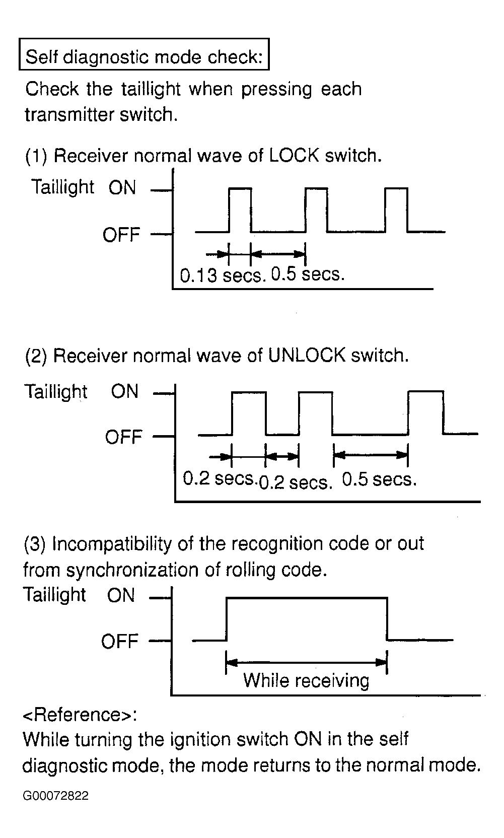 - Self-diagnostic mode check indicates all taillight responses are the same. Enter rewrite or add mode and reprogram transmitter codes. After performing programming procedure, recheck transmitter operation.