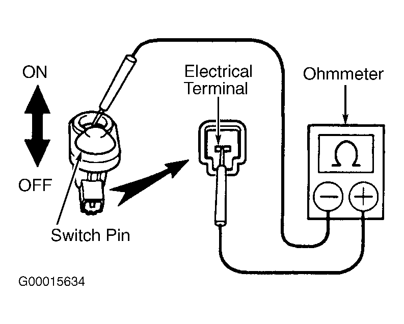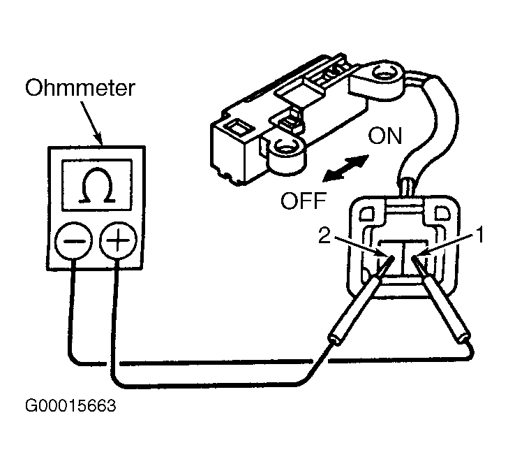 - For the driver's side front door, passenger's side front door and both sliding side doors, remove door courtesy switch from pillar post at rear of side door. See Figure. Using ohmmeter, check that continuity exists between electrical terminal and body of door courtesy switch with switch pin released to ON (door open) position and no continuity exists with switch pin depressed to OFF (door closed) position. See Fig 1. Replace door courtesy switch if defective.