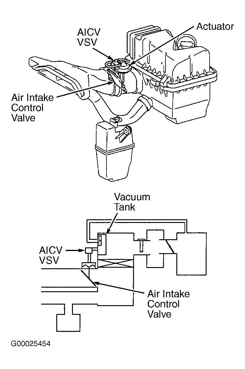 - Disconnect electrical connector and vacuum hoses from Air Intake Control Valve (AICV) Vacuum Switching Valve (VSV). See Figure and Fig 1