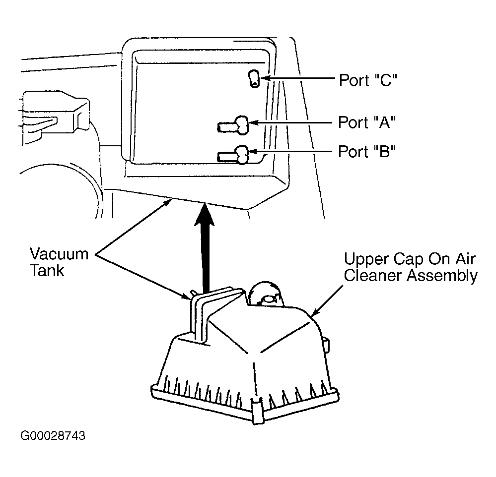 - Plug port "C". Apply air pressure to port "A". Ensure air does not flow from port "B". Plug ports "A" and "C". Using vacuum pump, apply 18 in. Hg of vacuum to port "B". Ensure vacuum reading will hold for at least one minute. If vacuum tank is okay, reconnect vacuum hoses and go to next step. If vacuum tank is defective, replace vacuum tank or upper cap on air cleaner assembly as necessary.
