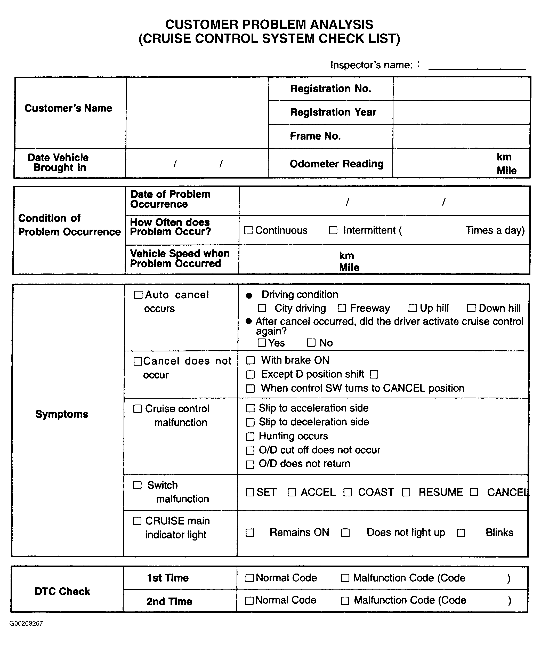 Customer Problem Analysis : use the Customer Problem Analysis (Cruise Control System Check List) in conjunction with the trouble shooting flow chart. See Fig 1 and Fig 2 .