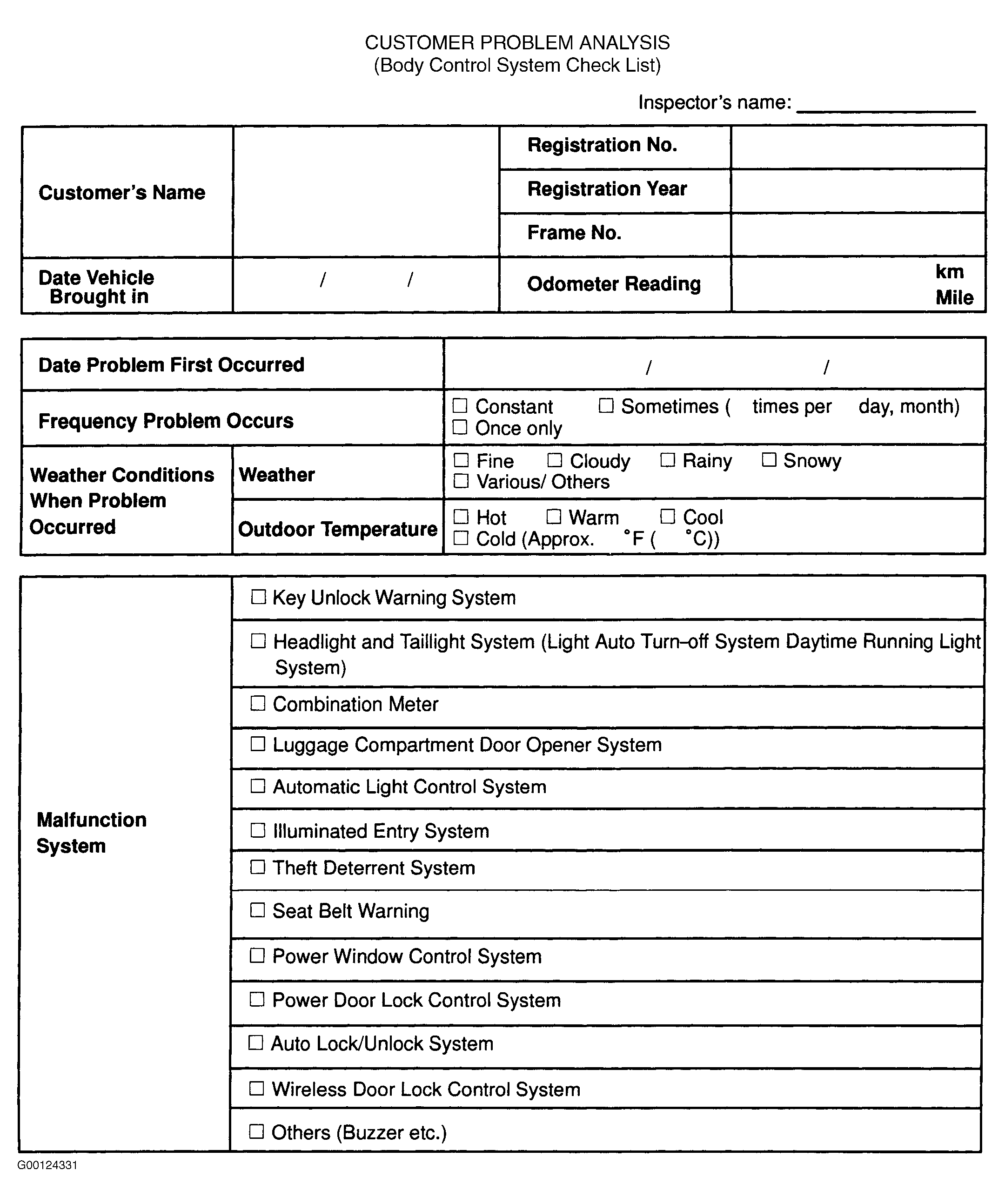 - Trouble shooting of a body control system complaint begins with verification of the customer problem. Perform Customer Problem Analysis (Body Control System Check List). See Fig 1. If problem occurs, go to step 3. If problem does not occur, go to next step.