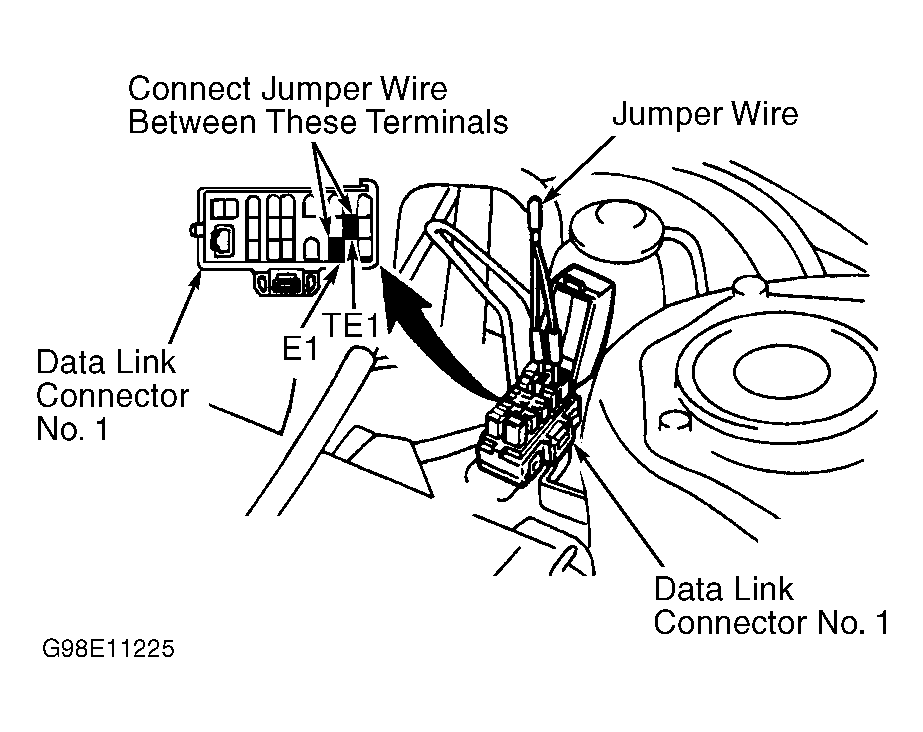 - Turn ignition off. Apply parking brake and place transaxle in Neutral. Ensure A/C is off. Install Jumper Wire (SST 09843-18020 or SST 09843-18040) between terminals TE1 and E1 on data link connector No. 1. See Fig 1. Data link connector No. 1 is located at driver's side of engine compartment, near strut tower.