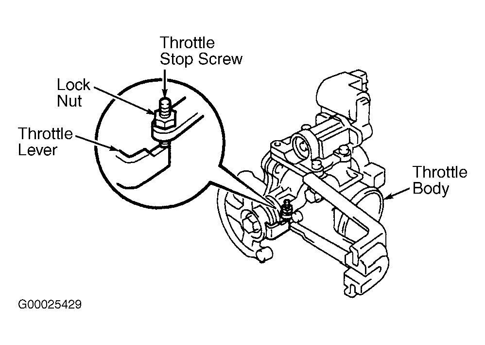 - Loosen lock nut on throttle stop screw. See Fig 1. With clearance between throttle stop screw and throttle lever, hold throttle fully closed and tighten throttle stop screw until it just contacts throttle lever. Once throttle stop screw contacts the throttle lever, tighten throttle stop screw an additional 1/4 turn and then tighten lock nut. Ensure Throttle Position (TP) sensor operates properly after performing this procedure. See THROTTLE POSITION SENSOR under ENGINE SENSORS & SWITCHES.