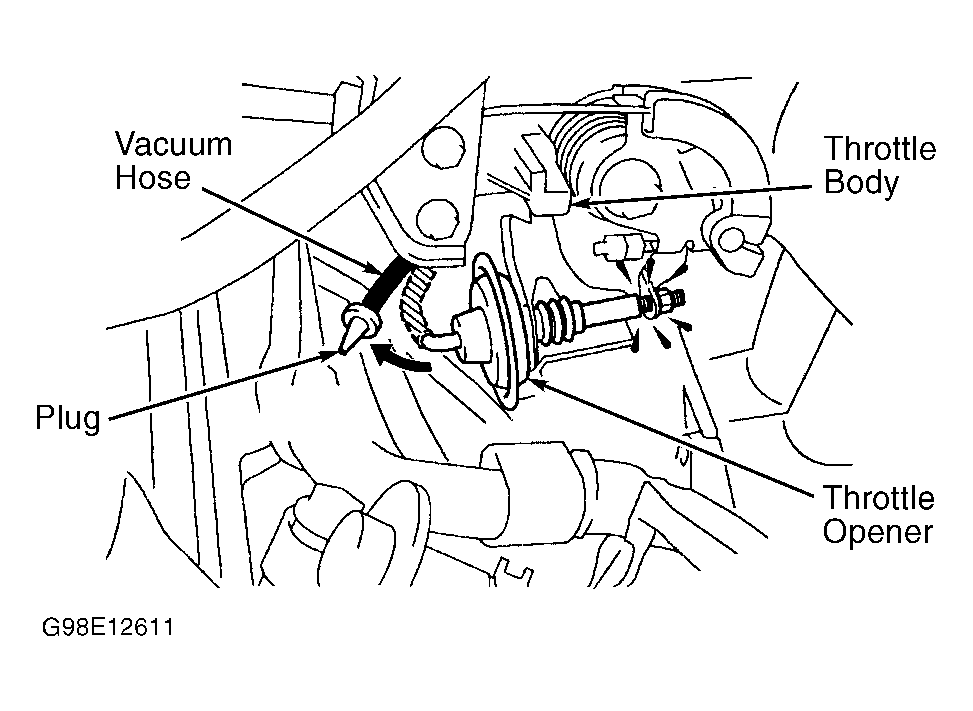 - With engine idling, disconnect and plug vacuum hose at throttle opener. See Fig 1. Note engine speed with vacuum hose disconnected from throttle opener. Engine speed should be 1200-1500 RPM.