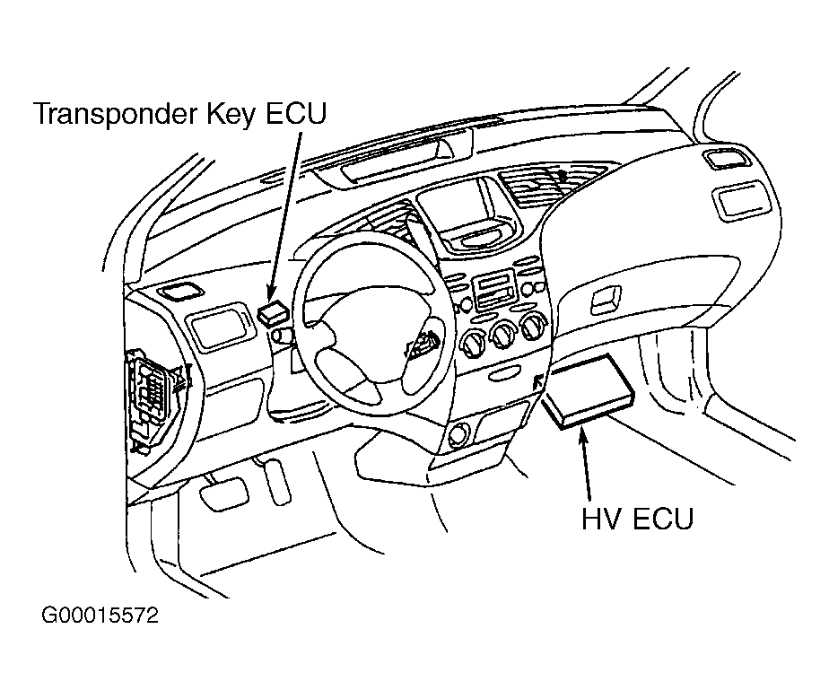 Hybrid Vehicle Electronic Control Unit (HV ECU) is located below carpet on floor panel, just below passenger's side of instrument panel. See Fig 1. If HV ECU is replaced, the HV ECU must be reprogrammed for the engine immobilizer system. Engine immobilizer system may also be referred to as Hybrid Vehicle (HV) immobilizer system. For programming procedures, see HYBRID VEHICLE ELECTRONIC CONTROL UNIT PROGRAMMING  under PROGRAMMING.