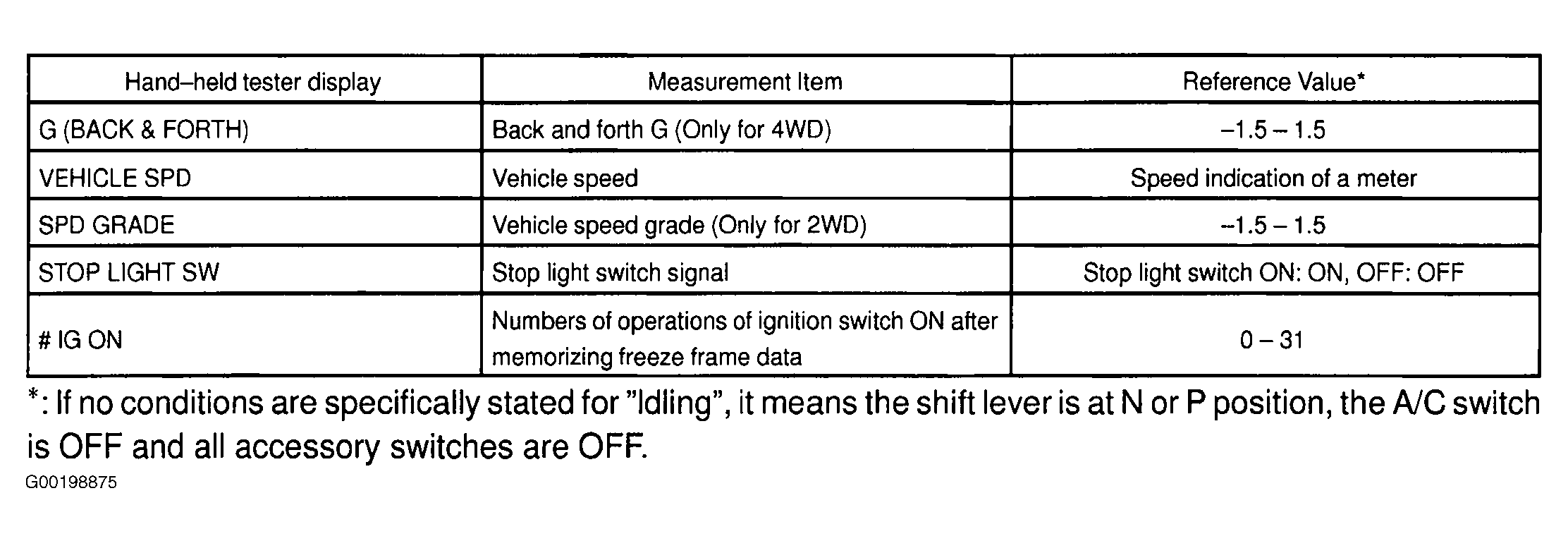 The vehicle (sensor) status at the occurrence of abnormality of the diagnosis code, and during the ABS operation can be memorized and displayed using the hand-held tester. Only one record of freeze frame data is stored. However, freeze frame data during the ABS operating is always updated. After storage of freeze frame data, up to 31 ignition "ON" operations are stored and displayed. If the ignition switch "ON" operation exceeds 31 times, "31" appears on the display. See Fig 1.
