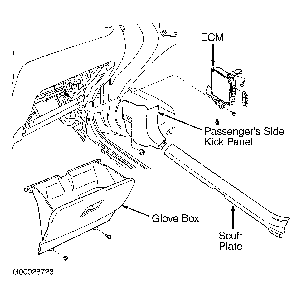 Engine Control Module (ECM) is located behind passenger's side kick panel, just below instrument panel. See Fig 1.