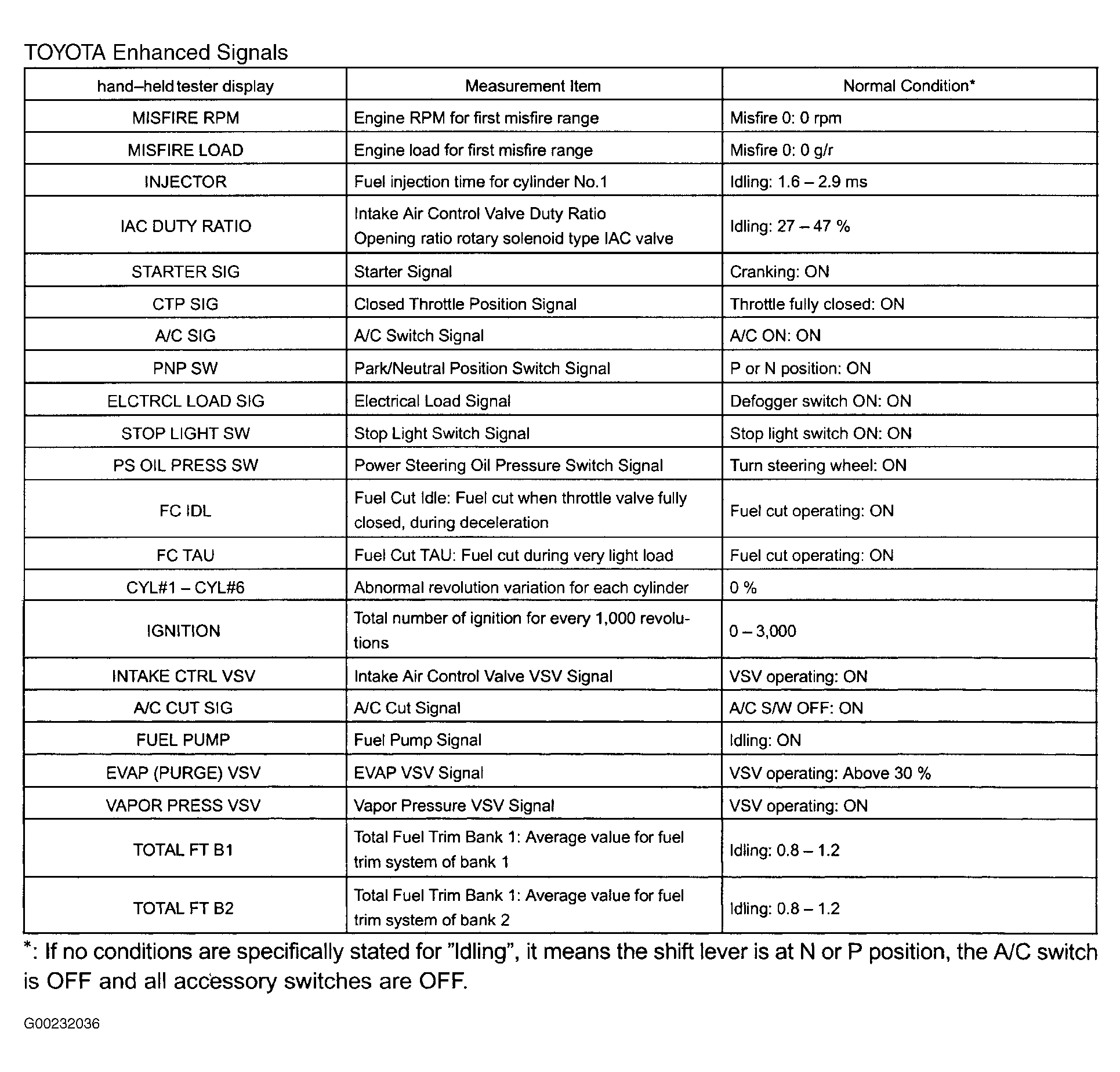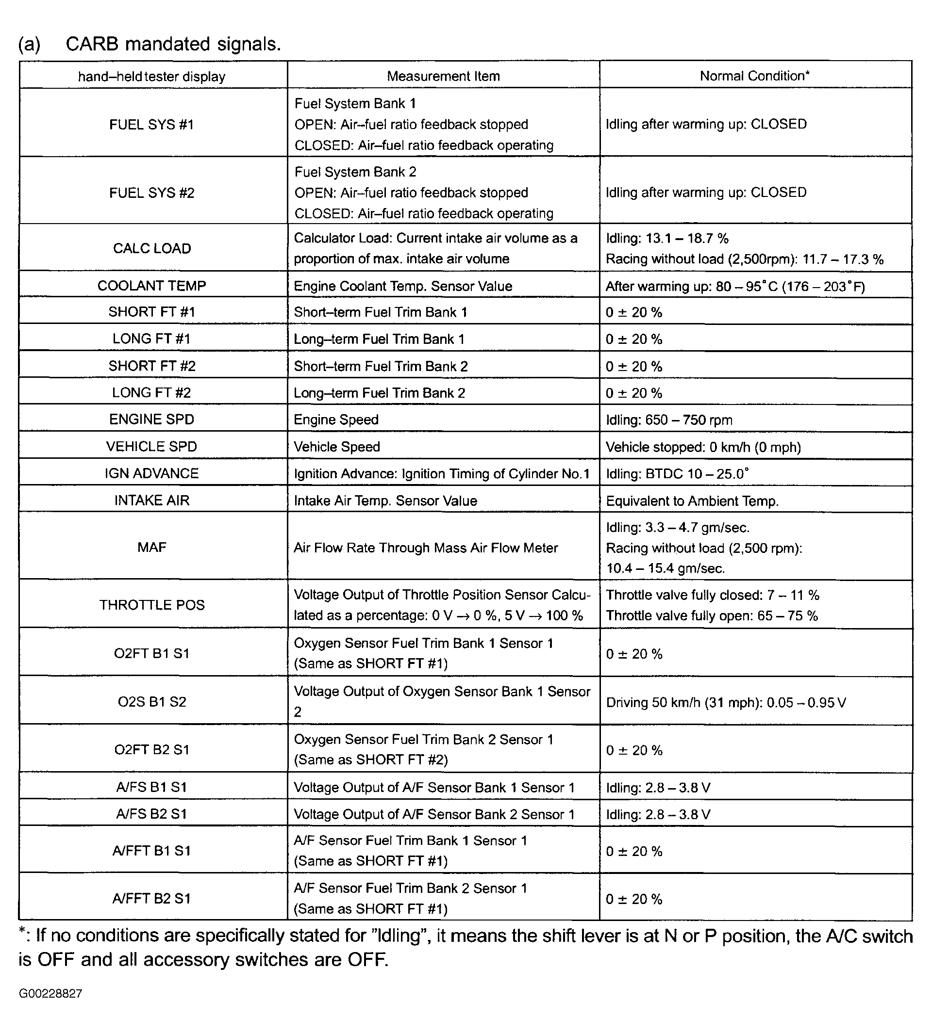 The values given below for normal condition are representative values, so a vehicle may still be normal even if it's value varies differ from those listed here. So do not decide whether a part is faulty or not solely according to the normal condition here.