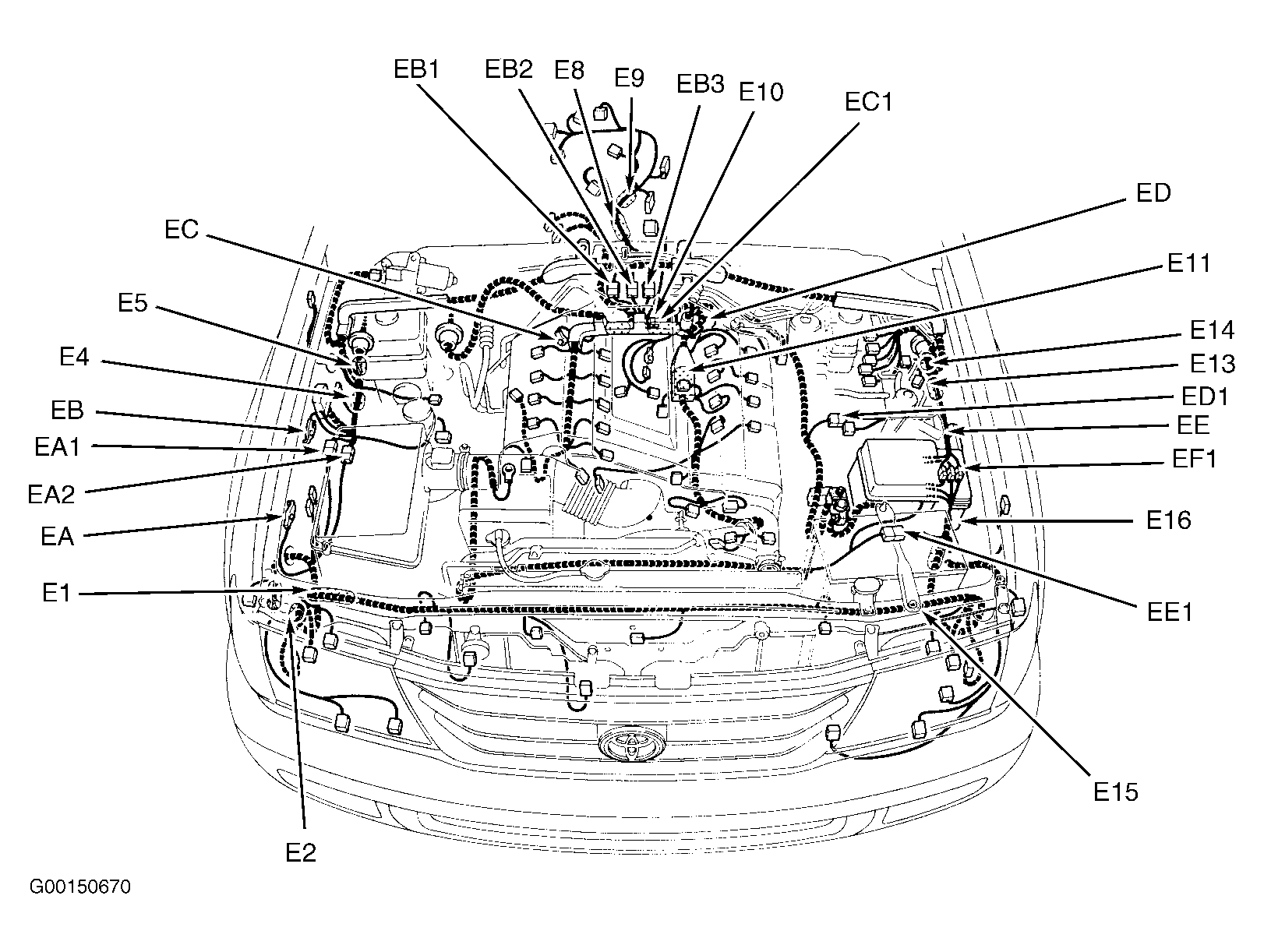 E2 In engine compartment harness, at right front of engine compartment. See Figure.