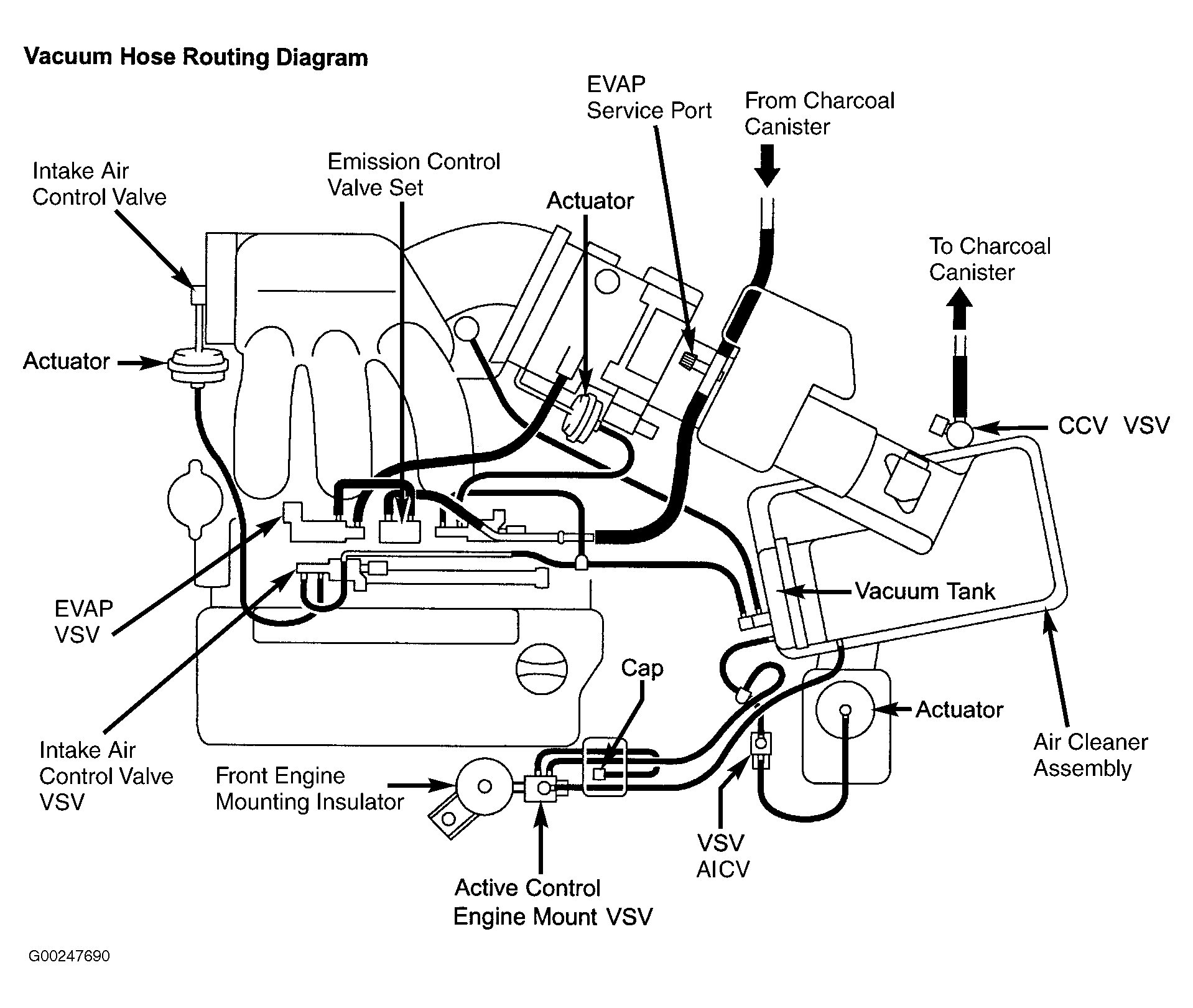 - Disconnect electrical connector and vacuum hoses from Air Intake Control Valve (AICV) Vacuum Switching Valve (VSV). See Figure, Figure and Fig 1