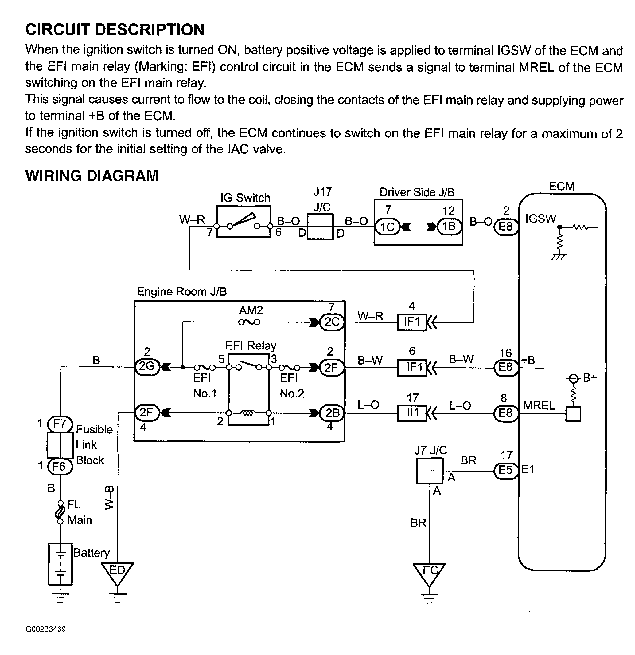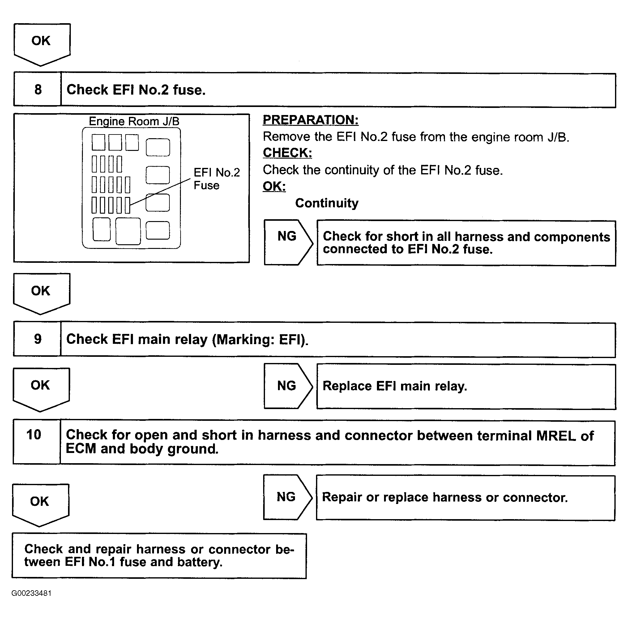For engine control module power source circuit inspection, see Fig 1-Fig 4 . For circuit identification, see ENGINE PERFORMANCE in appropriate SYSTEM WIRING DIAGRAMS article in ELECTRICAL. Before replacing ECM, check ECM connectors and ground circuits. See ENGINE CONTROL MODULE POWER & GROUND CIRCUITS under COMPUTERIZED ENGINE CONTROLS. To check ignition switch, see appropriate STEERING COLUMN SWITCHES article in ACCESSORIES & EQUIPMENT. To check EFI main relay, see EFI MAIN RELAY under MODULES, MOTORS, RELAYS & SOLENOIDS.