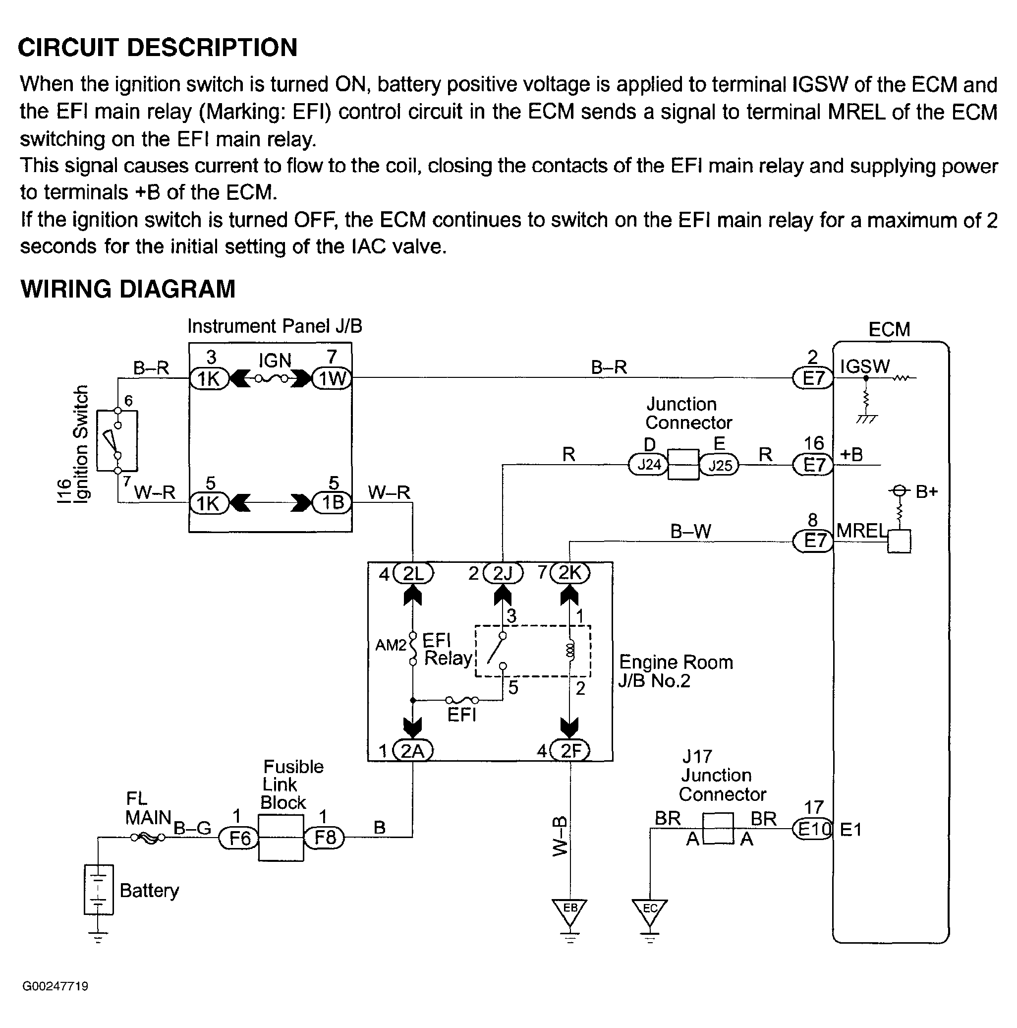 For engine control module power source circuit inspection, see Fig 1-Fig 5 . For circuit identification, see ENGINE PERFORMANCE in appropriate SYSTEM WIRING DIAGRAMS article in ELECTRICAL. Before replacing ECM, check ECM connectors and ground circuits. See ENGINE CONTROL MODULE POWER & GROUND CIRCUITS under COMPUTERIZED ENGINE CONTROLS. To check ignition switch, see appropriate STEERING COLUMN SWITCHES article in ACCESSORIES & EQUIPMENT. To check EFI main relay, see EFI MAIN RELAY under MODULES, MOTORS, RELAYS & SOLENOIDS.