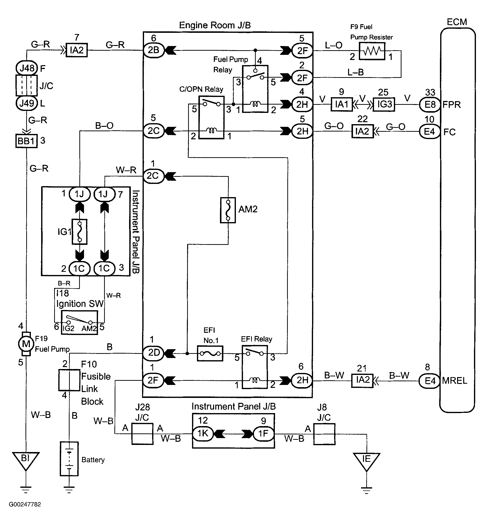 For fuel pump control circuit inspection and wiring diagram, see Fig 1-Fig 7 . To check fuel pump relay, see FUEL PUMP RELAY under MODULES, MOTORS, RELAYS & SOLENOIDS. To check fuel pump operation, see FUEL DELIVERY under FUEL SYSTEMS. To check circuit opening relay, see CIRCUIT OPENING RELAY under MODULES, MOTORS, RELAYS & SOLENOIDS. For circuit identification, see ENGINE PERFORMANCE in appropriate SYSTEM WIRING DIAGRAMS article in ELECTRICAL. To check fuel pump resistor operation, see FUEL DELIVERY under FUEL SYSTEMS.