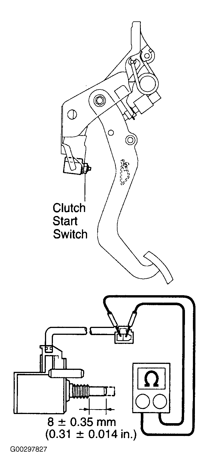On manual transmission models, vehicle will not crank unless clutch pedal is depressed. If vehicle will not crank while clutch pedal is depressed, test clutch start switch by testing continuity. With switch ON (pushed in) there should be continuity. when the switch is OFF (out), there should not be continuity. See Fig 1.
