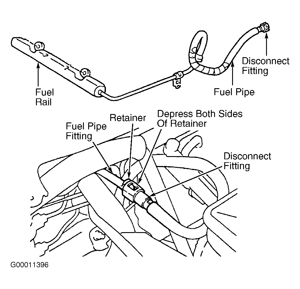 - Depress both sides of retainer and pull fuel pipe with disconnect fitting from fuel pipe fitting. See Fig 1.