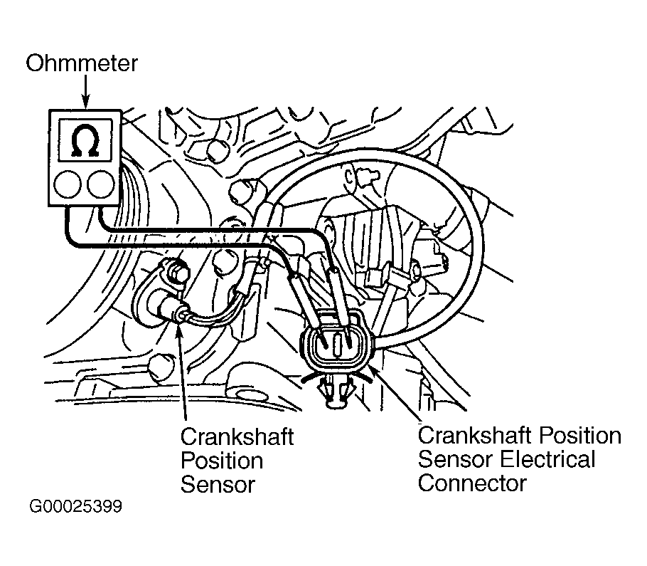 - Disconnect crankshaft position sensor electrical connector. Using ohmmeter, check resistance between electrical terminals on crankshaft position sensor electrical connector. Ensure crankshaft position sensor resistance is within specification. See CRANKSHAFT POSITION SENSOR RESISTANCE table. Replace crankshaft position sensor if resistance is not within specification. See CRANKSHAFT POSITION SENSOR under IGNITION SYSTEMS in REMOVAL & INSTALLATION - 4-CYLINDER article. Reinstall crankshaft position sensor electrical connector and A/C compressor. Tighten A/C compressor retaining bolts to 18 ft. lbs. (24 N.m). Install lower front engine cover.