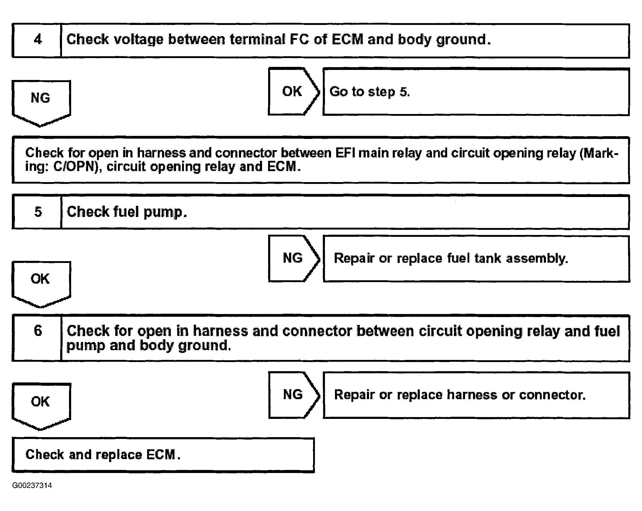 For fuel pump control circuit inspection and wiring diagram, see Fig 1-Fig 5 . Before replacing ECM, check ECM connectors and ground circuits. See ENGINE CONTROL MODULE POWER & GROUND CIRCUITS .