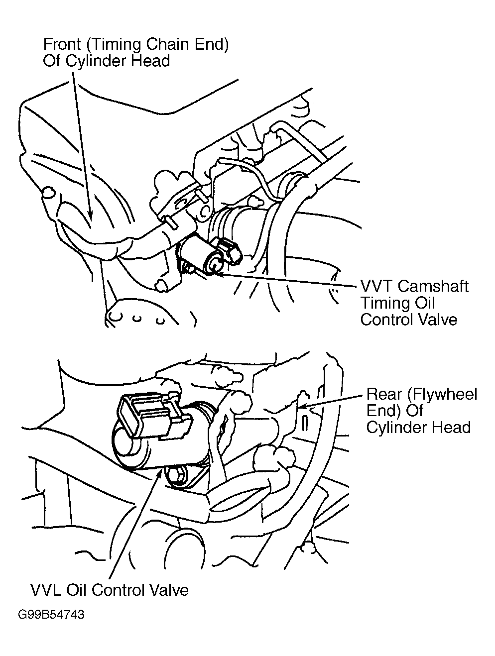 - Remove No. 2 cylinder head cover located on top of engine, above ignition coils and valve cover. To check VVL oil control valve resistance, disconnect electrical connector at VVL oil control valve. VVL oil control valve is located at intake manifold side of cylinder head, near flywheel end of engine. See Fig 1.