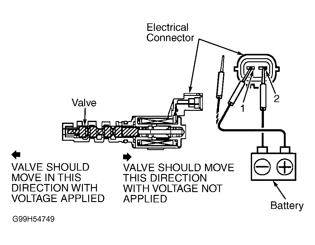 - Note movement of valve inside VVL oil control valve while applying and disconnecting battery voltage and ground to terminals No. 1 and 2 on VVL oil control valve. See Fig 2. Valve should move outward toward end of assembly opposite electrical connector with voltage applied and should move inward toward electrical connector end of assembly with voltage not applied. See Fig 2. Replace VVL oil control valve if operation is not as specified.