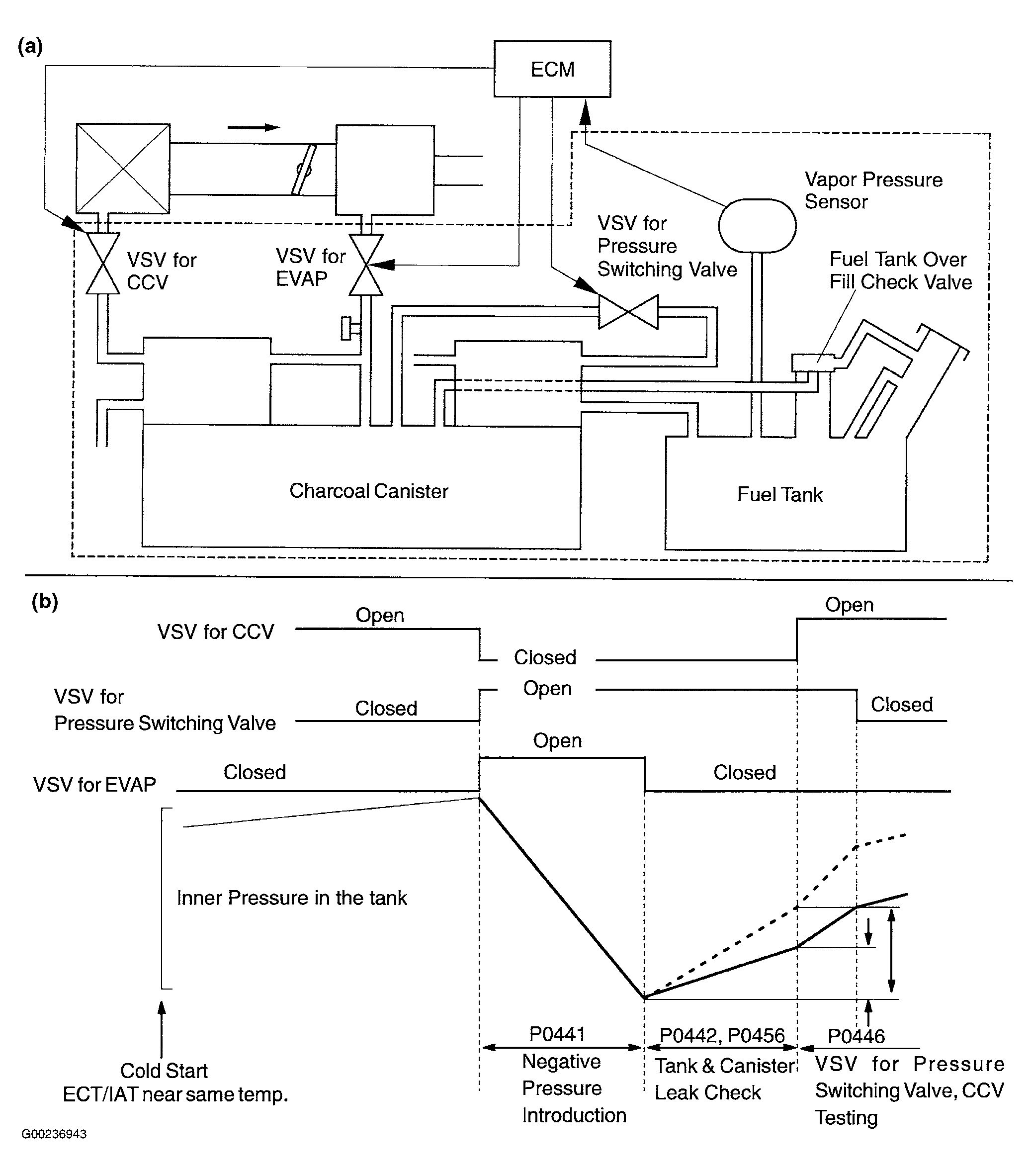 The vapor pressure sensor, VSV for EVAP, VSV for canister closed valve (CCV) and VSV for pressure switching valve are used to detect abnormalities in the evaporative emission control system. The ECM decides whether there is an abnormality in the evaporative emission control system based on the vapor pressure sensor signal. DTCs P0442 or P0456 is recorded by the ECM when evaporative emissions leak from the components or when the vapor pressure sensor malfunctions. See Fig 1.