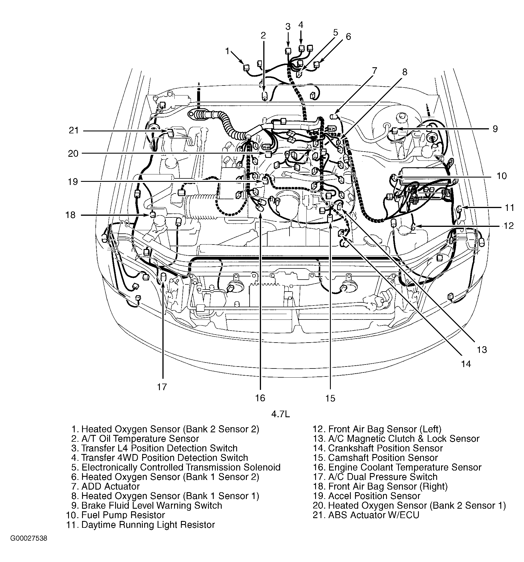 | ABS Actuator W/ ECU (4.7L) | In right rear corner of engine compartment. See Figure. |
