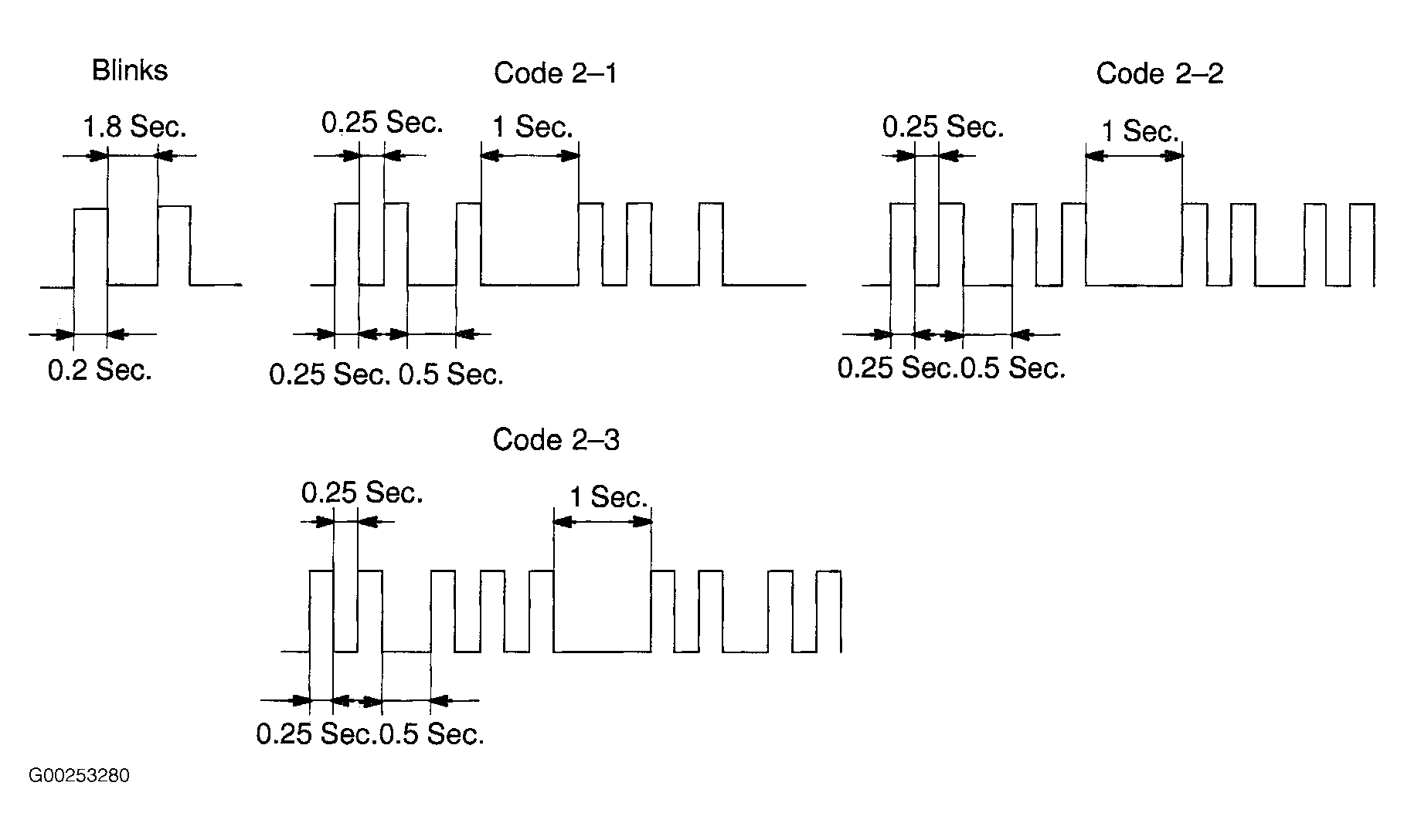 If ignition key registration was complete, and system is operating normally, SECURITY indicator light should flash when ignition key was removed from ignition lock cylinder. If ignition key registration was not completed with ECM in automatic registration mode, a code 2-1 will be displayed by SECURITY indicator light. When inserting an already registered ignition key, a code 2-2 will be displayed by SECURITY indicator light. When exceeding the number of keys which can be registered, a code 2-3 will be displayed by SECURITY indicator light. See Fig 1.