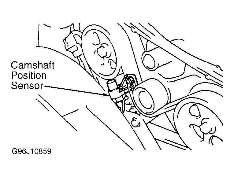 Camshaft position sensor is a pick-up coil located behind upper timing belt cover, near passenger's side camshaft sprocket and uses a signal plate on outer circumference of passenger's side camshaft sprocket. See Figure. ECM uses input signal from camshaft position sensor to determine the standard crankshaft angle. DTC is set when ECM does not receive input signal from camshaft position sensor with engine cranking or with engine speed of 600 RPM or more. Possible causes are: