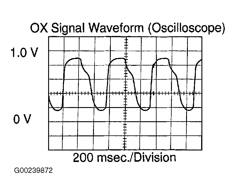 - After confirming that the waveform of the heated oxygen sensor bank 1, 2 sensor 1 (OX1A, OX2A), oscillates between zero volts and 1 volt during feedback to the ECM, check waveform of heated oxygen sensor bank 1, 2 sensor 2 (OX1B, OX2B). If there is a malfunction in system, waveform of heated oxygen sensor bank 1, 2 sensor 2 (OX1B, OX2B) is almost the same as heated oxygen sensor bank 1, 2 sensor 1 (OX1A, OX2A). See Fig 1. There are some cases where, even though a malfunction exists, MIL may either light up or not light up.