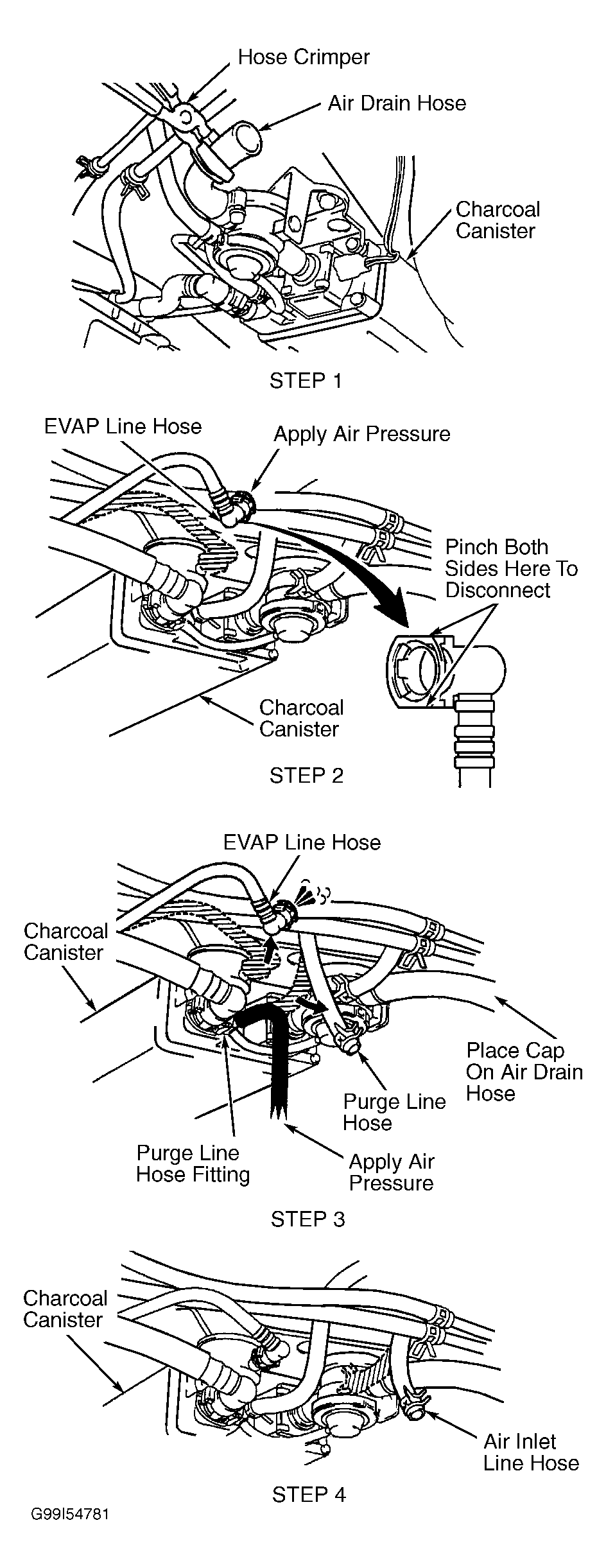18. Apply .58 psi (.040 kg/cm2 ) air pressure to purge line hose fitting on charcoal canister. Perform STEP 3 in illustration. See Fig 1. Ensure air flows from EVAP line hose when air pressure is applied to purge line hose fitting on charcoal canister. If fuel tank is full of fuel, air may not flow from EVAP line hose, as overfill check valve may be closed. Ensure fuel tank is not full of fuel when checking for airflow at EVAP line hose.