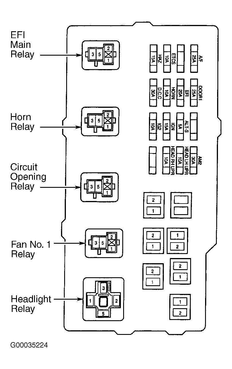 Application Location Camry & Camry Solara In Fuse/Relay Box At Driver's Side Front Corner Of Engine Compartment Celica In Fuse/Relay Box At driver's side Front Corner Of Engine Compartment, Just In Front Of Strut Tower Corolla Center Relay In Relay Box Behind Driver's Side Kick Panel ECHO In Fuse/Relay Box Behind Driver's Side Of Instrument Panel Highlander In Relay Box Just Above Driver's Side Kick Panel MR2 In Relay Box On Firewall At Driver's Side Front Corner Of Engine Compartment Prius & RAV4 In Fuse/Relay Box At Driver's Side Front Corner Of Engine Compartment Tacoma Behind Lower Instrument Panel Cover, Next To Driver's Side Of Steering Column (1) Circuit opening relay may be marked as CIR OPN relay. - To test circuit opening relay continuity, using ohmmeter, check for continuity and no continuity between specified terminals on circuit opening relay. See Figure and Figure .