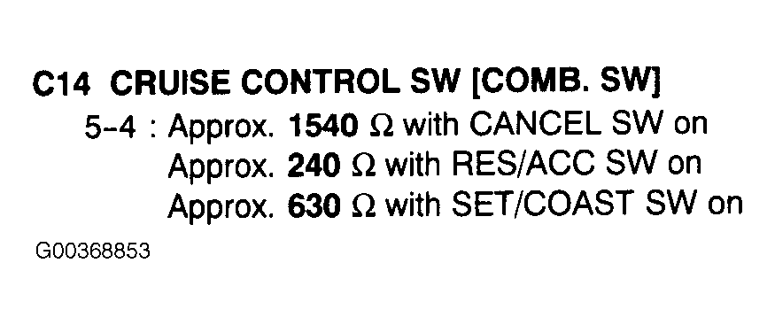 For Main switch circuit testing procedure, see Fig 1-Fig 4 . For cruise control switch resistance values, see Fig 5.