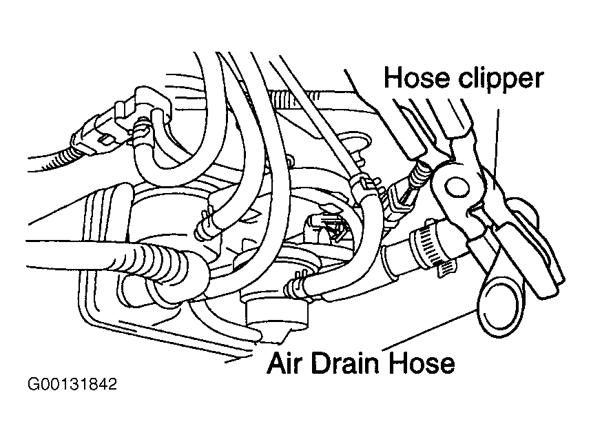3. Disconnect vacuum gauge from EVAP service port of purge line. Connect pressure gauge to EVAP service port on purge line. Using hose clipper, close off air drain hose at marked position. See Fig 3. Add 13.5-15.5 in. Aq. pressure from EVAP service port. Two minutes after pressure is added, gauge should indicate greater than 7.7-8.8 in. Aq. If pressure cannot be added, hose connecting VSV-canister-fuel tank has slipped off or VSV is open. Ensure pressure decreases when fuel tank cap is removed while adding pressure. See Fig 4. If pressure does not decrease when filler cap is removed, then hose connecting service port to fuel tank is blocked. Disconnect pressure gauge from EVAP service port on purge line.