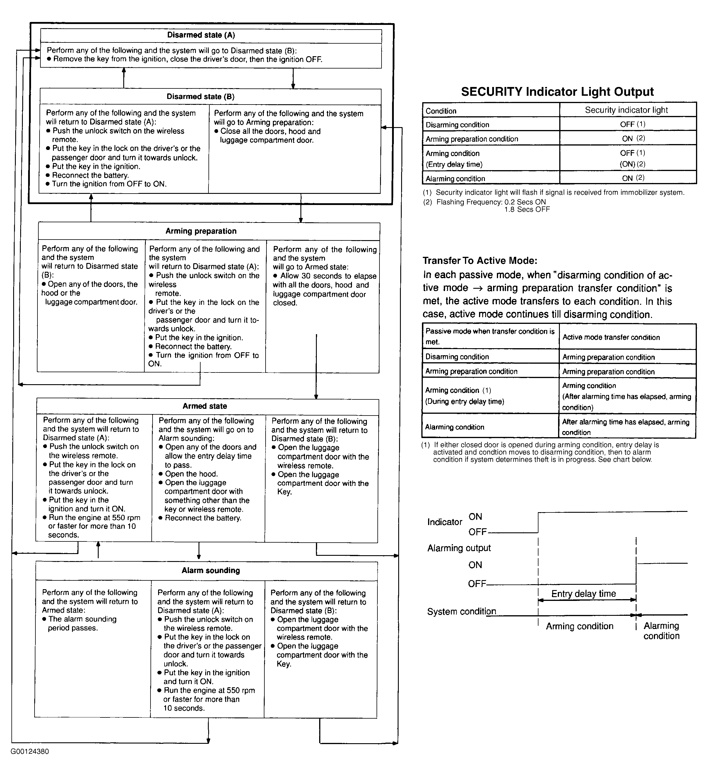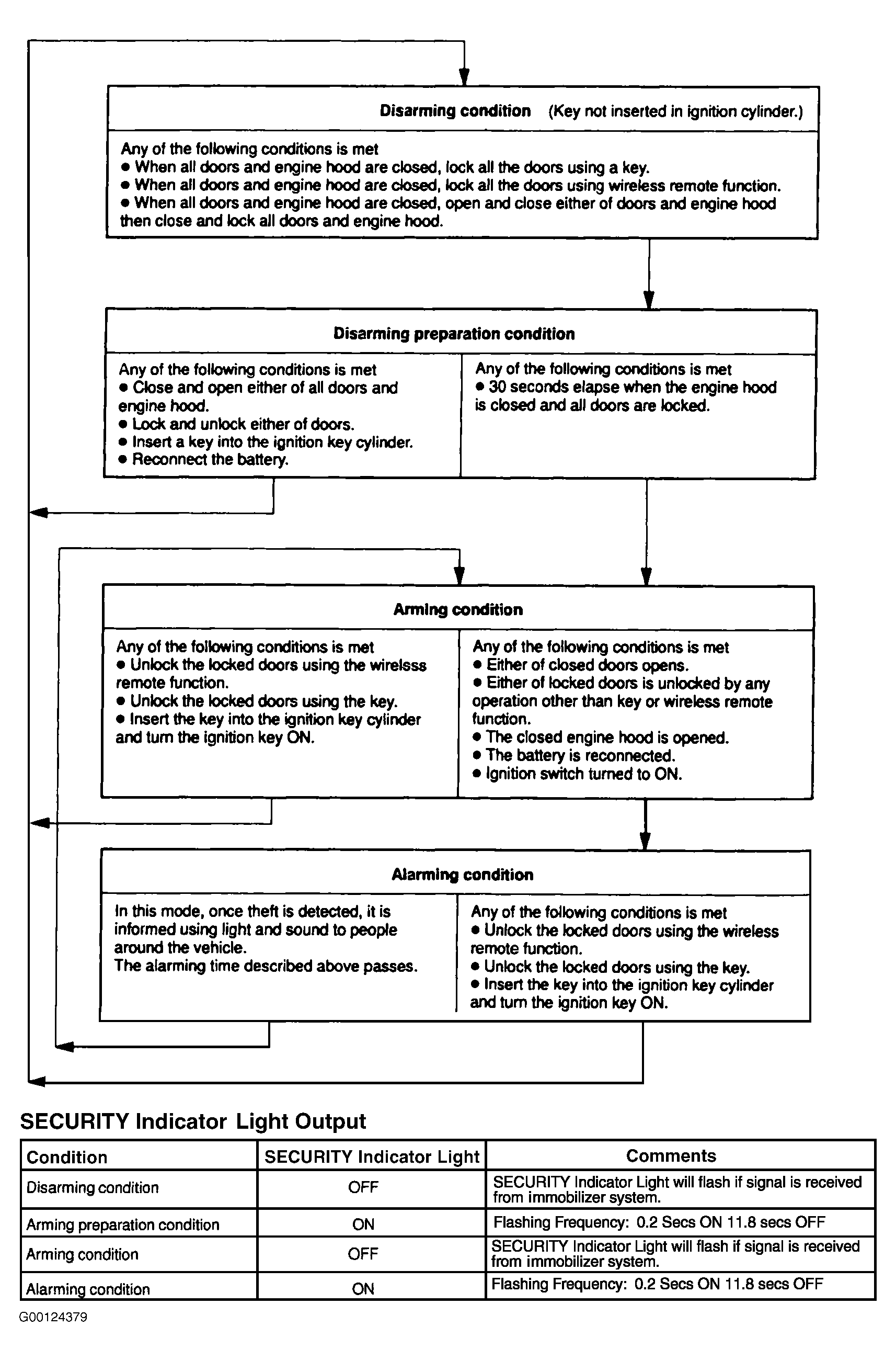 This is when a user exits the vehicle and theft deterrent function is possible. If any door is unlocked without the key in the ignition switch while the system is in the arming condition, the system will activate the alarm condition. - Alarming Condition