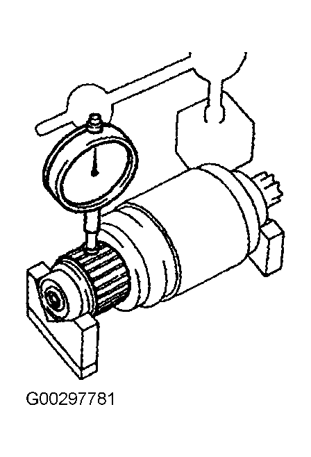 - Place the commutator on V-blocks and use a dial indicator to measure runout (out-of-round). See Fig 1. If commutator runout is more than specification, turn commutator on a lathe and proceed to step 3. For specification, see STARTER SPECIFICATIONS .