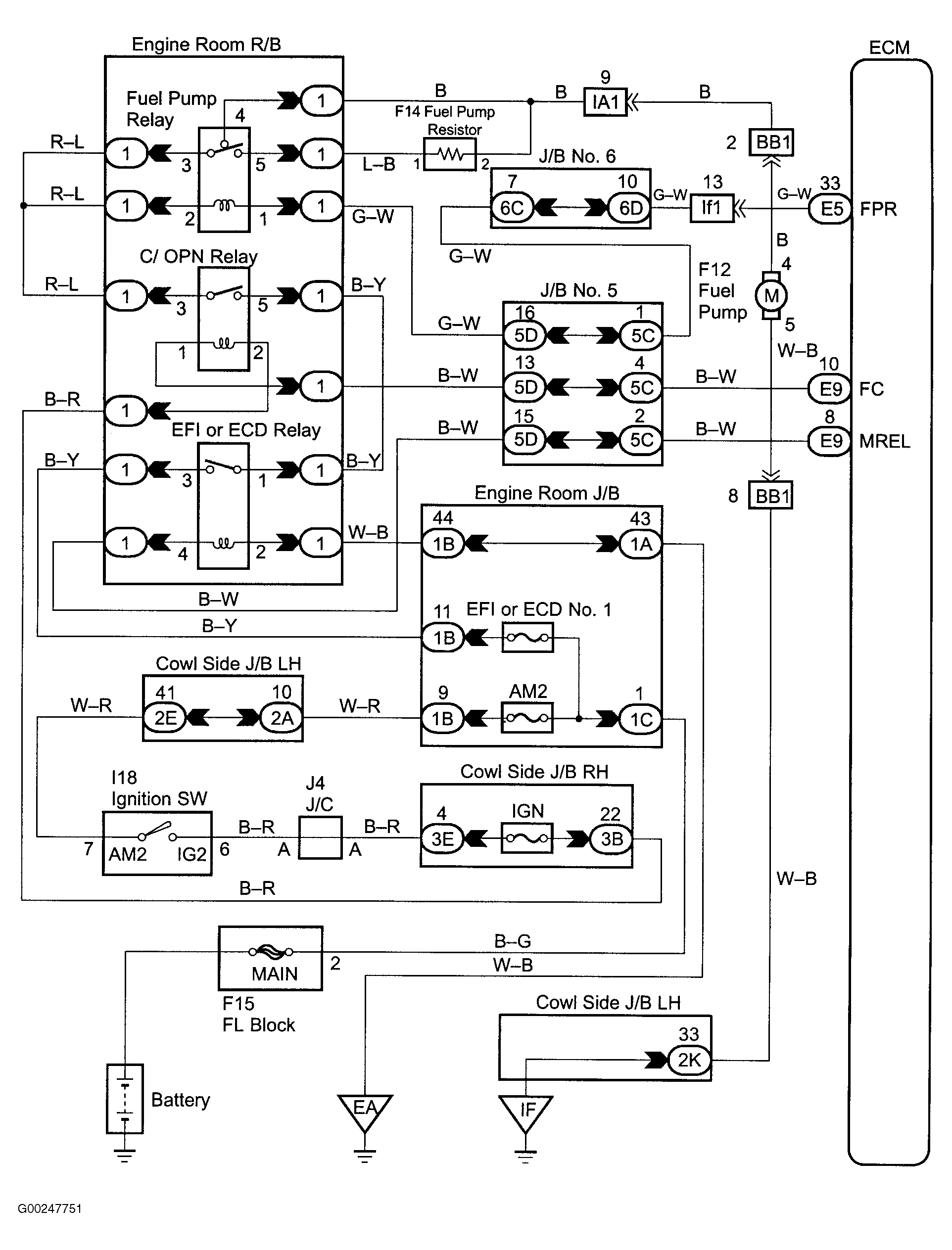 For fuel pump control circuit inspection and wiring diagram, see Fig 1-Fig 7 . To check fuel pump relay, see FUEL PUMP RELAY under MODULES, MOTORS, RELAYS & SOLENOIDS. To check fuel pump operation, see FUEL DELIVERY under FUEL SYSTEMS. To check circuit opening relay, see CIRCUIT OPENING RELAY under MODULES, MOTORS, RELAYS & SOLENOIDS. For circuit identification, see ENGINE PERFORMANCE in appropriate SYSTEM WIRING DIAGRAMS article in ELECTRICAL. To check fuel pump resistor operation, see FUEL DELIVERY under FUEL SYSTEMS.