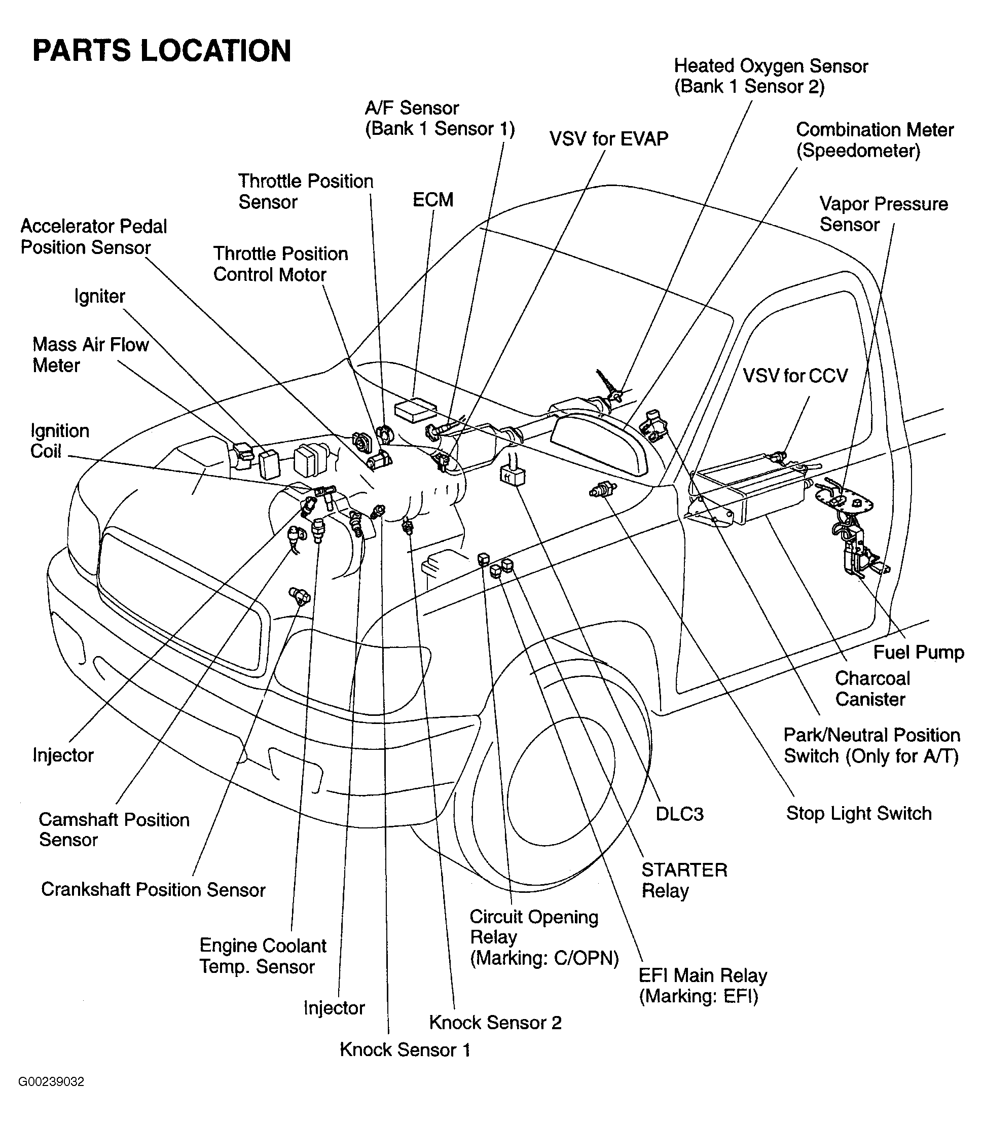 When performing diagnostic tests, it may be necessary to identify Engine Control Module (ECM) electrical connector terminals which are referenced to in testing procedure. See Fig 1. To locate engine control system components, see Fig 2.