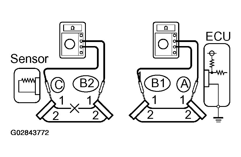 Therefore, it is found out that there is an open circuit between terminal 1 of connector "B2" and terminal 1 of connector "C".
