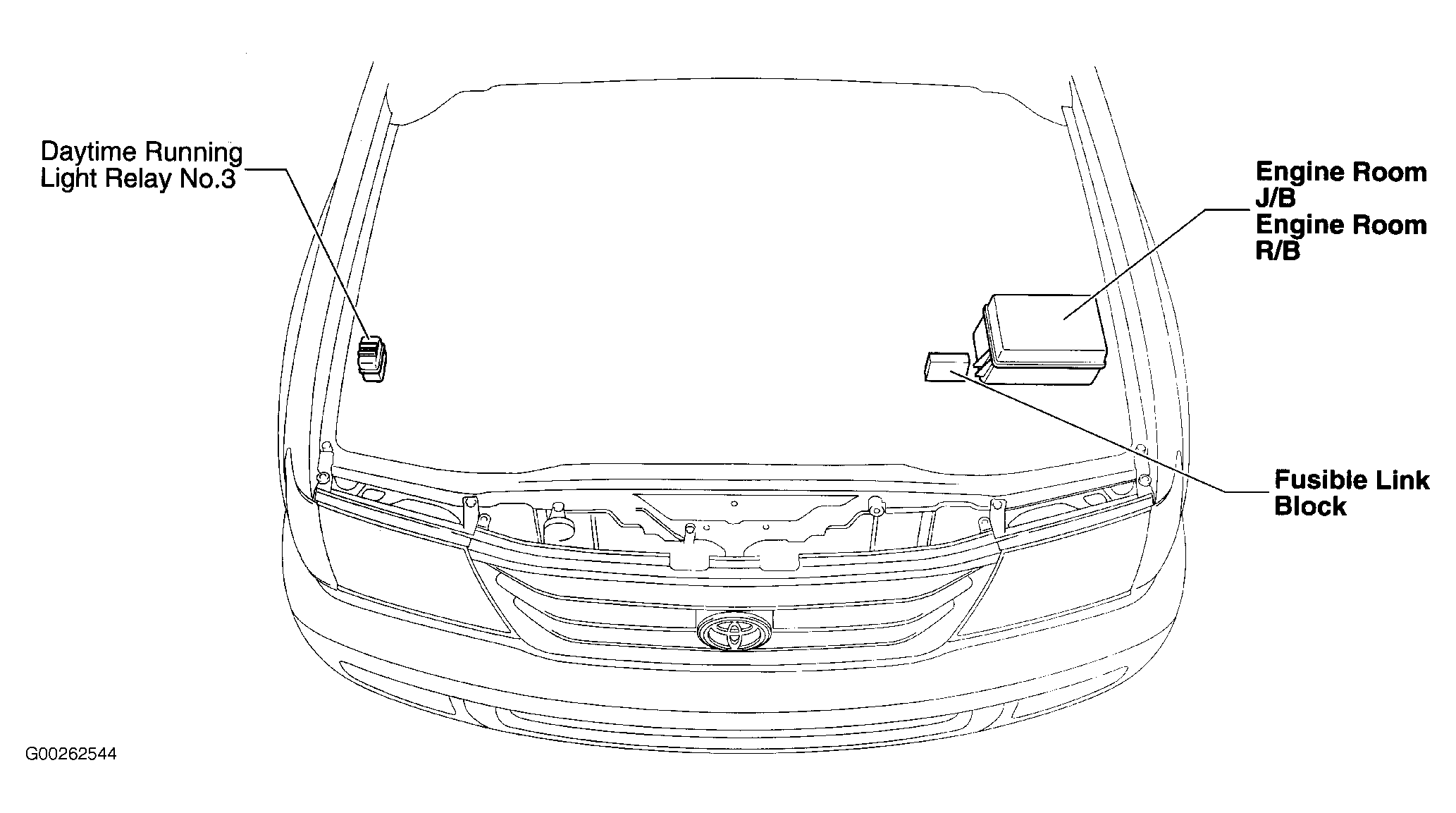 | Engine Room R/B | Left front of engine compartment. See Figure. |