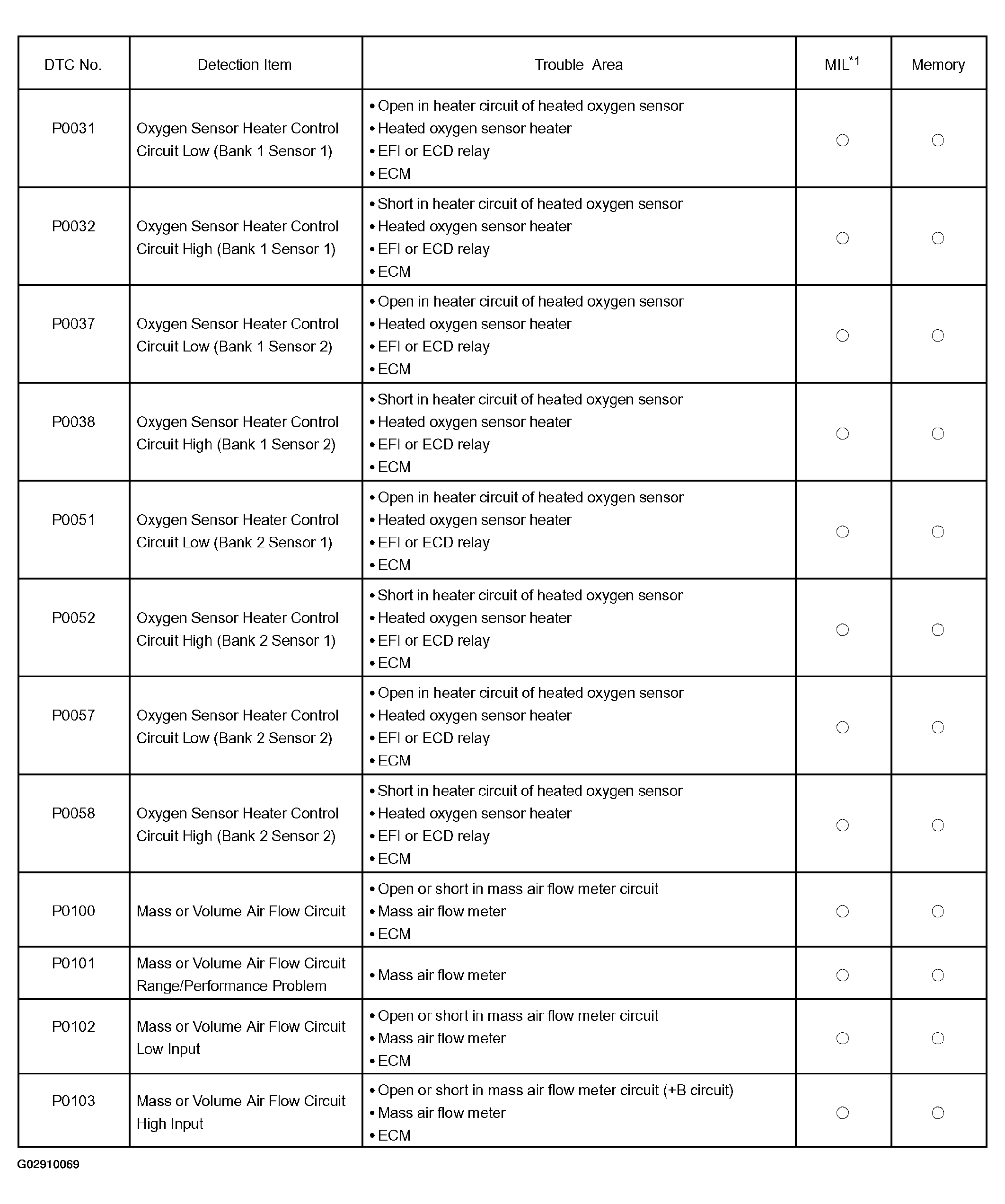 | DTC P0031 | OXYGEN SENSOR HEATER CONTROL CIRCUIT LOW (BANK 1 SENSOR 1) |