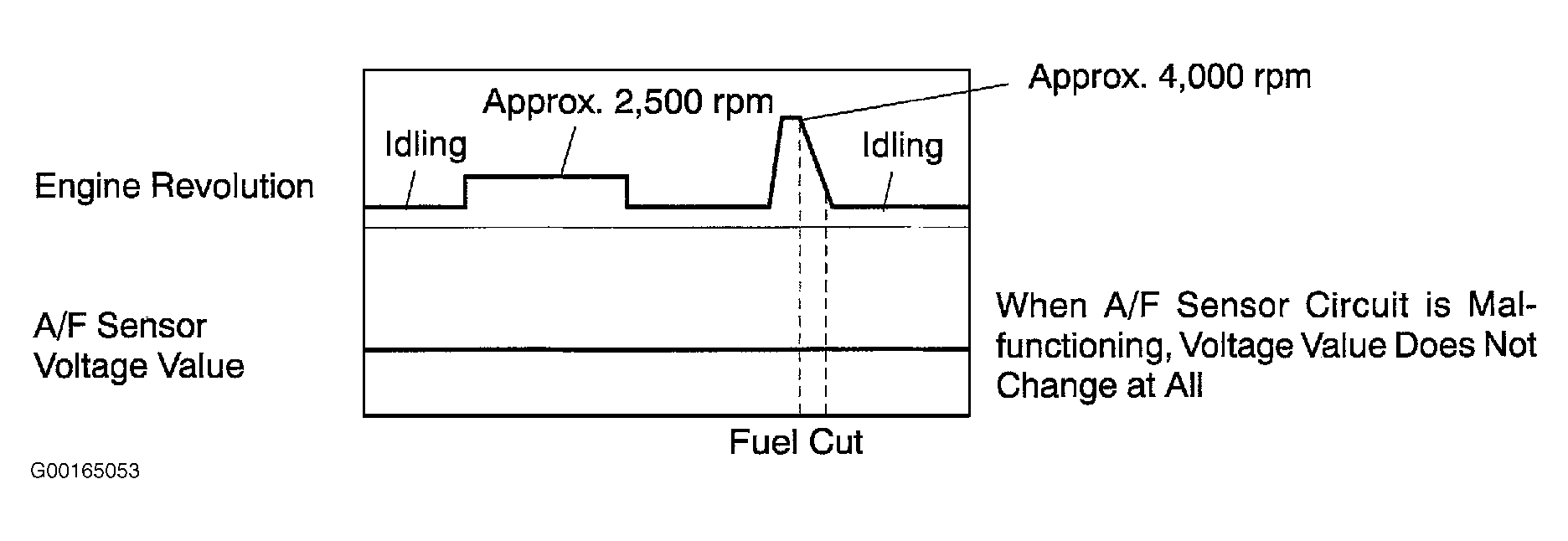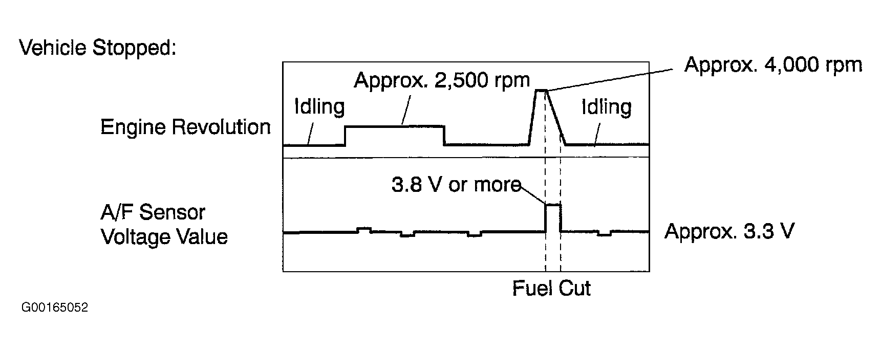 NOTE: Whenever the output voltage of the A/F sensors remains at approximately 3.3 volts (0.660 volts with OBD-II scan tool under any conditions as well as the above conditions, the A/F sensors may have an open circuit. This will happen also when the A/F sensor heater has an open circuit. Whenever the output voltage of the A/F sensors remains at a certain value of approximately 3.8 volts (0.76 volts on OBD-II scan tool) or more, or 2.8 volts (0.56 volts on OBD-II scan tool) or less under any conditions as well as the above conditions, the A/F sensor may have a short circuit.