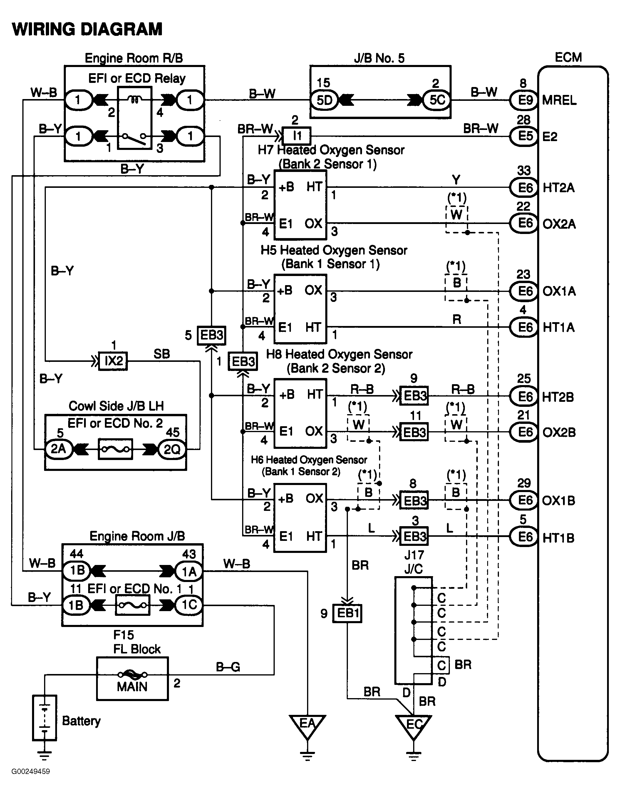 For ECM location, see Figure. For ECM connector terminal view, see Figure. For HO2S circuit wiring diagram, see Figure. For location of emission related components, see Figure.