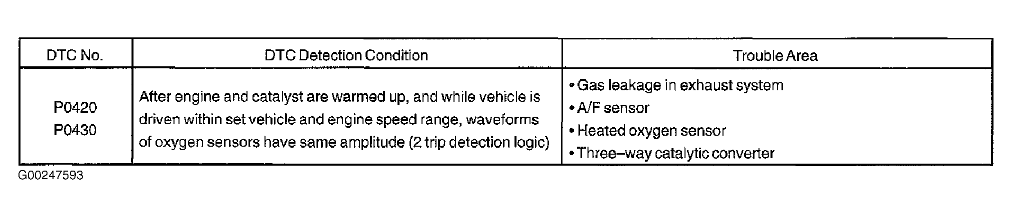 Home >> Toyota >> 2004 >> Matrix Base, 4WD >> Repair and Diagnosis >> External Pages >> Different car >> Section 132 (Engine Control System Self Diagnostics) >> Diagnostic Tests >> DTC P0420: Catalyst System Efficiency Below Threshold (Bank 1) &/Or P0430: Catalyst System Efficiency Below Threshold (Bank 2) >> Possible Causes