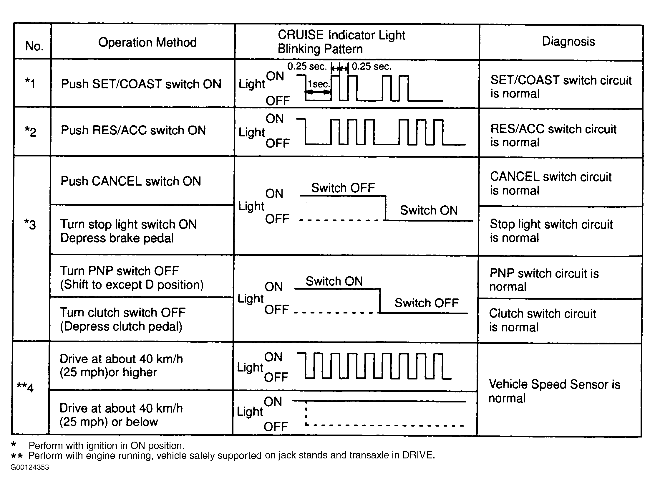 - Perform park/neutral position switch input signal check. See STEP 3 of Cruise Control Input Signal Check. See Figure. If park/neutral position switch input signal is not as specified, go to next step. If input signals are as specified, no problem is indicated at this time. Fault may be intermittent, go to step 11.